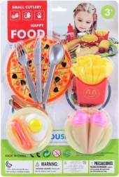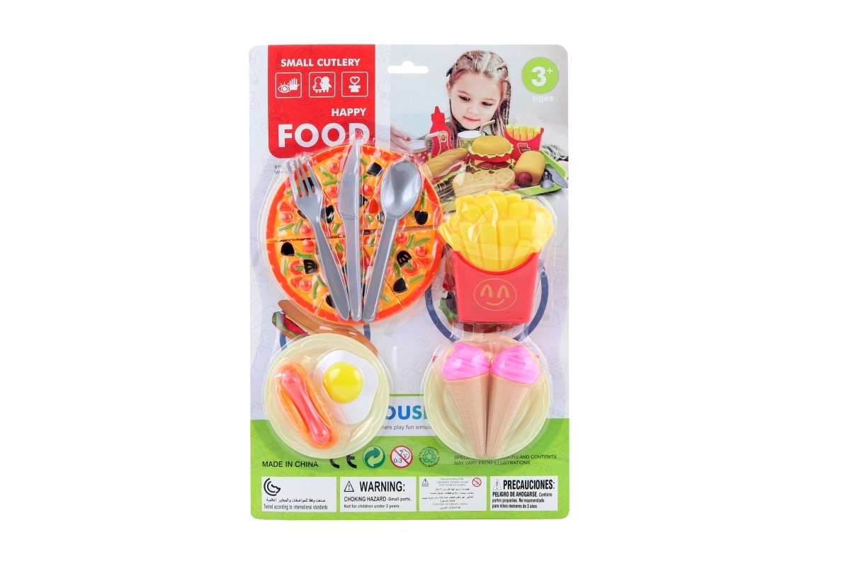 - A szett tartalma: szeletekre vágott pizza, dobozos hasábburgonya, hot dog, tükörtojás, 2 fagyi, 2 tányér, evőeszköz