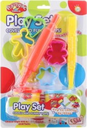 - 2 tégely gyurma, nyújtóhenger, olló, 4 forma