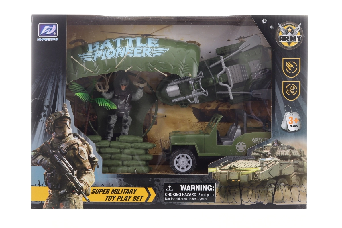 Szórakoztató katonai készlet kis kalandoroknak, amely tartalmaz egy ejtőernyőst működő ejtőernyővel, egy dzsipet, egy vízi robogót és további kiegészítőket az akciódús küldetésekhez. Tartós műanyagból készült, 3 éves kortól ajánlott.