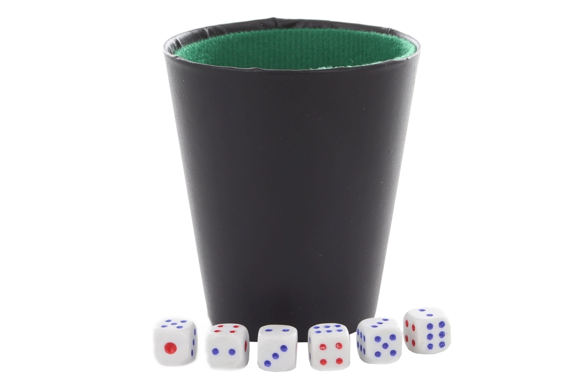 Élvezze a kényelmes és kulturált kockadobást a műanyag pohárnak köszönhetően, melynek filc bélése csillapítja a zajt és segít kontroll alatt tartani a kockákat. A készlet hat darab, körülbelül 1,2 cm-es szabványos dobókockát tartalmaz – klasszikus társasjátékokhoz ideális.