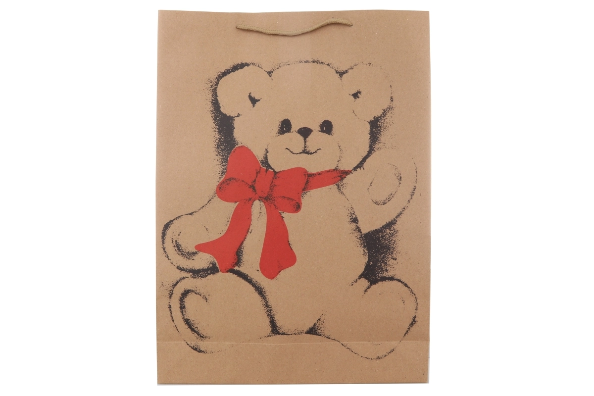 Stílusos ajándéktáska medvemintával nagy méretben, ideális az ajándékok elegáns átadásához. A masszívabb kivitelnek és a praktikus méreteknek (31 × 42 × 9,5 cm) köszönhetően könyvekhez, játékokhoz és nagyobb csomagokhoz is illik. Remek dekoratív megoldás minden alkalomra.