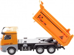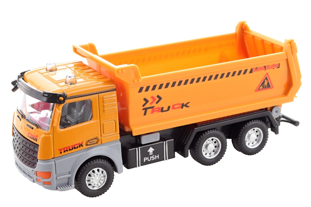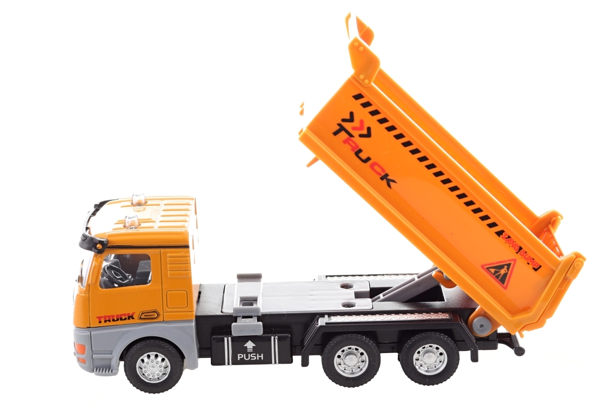 Ez a masszív billenős teherautó körülbelül 1:48 méretarányban valósághű építkezős játékélményt nyújt. A fém karosszéria és az erős műanyag elemek bírják a mindennapos használatot, míg a billenőplató megkönnyíti az apró tárgyak fel- és lerakását.