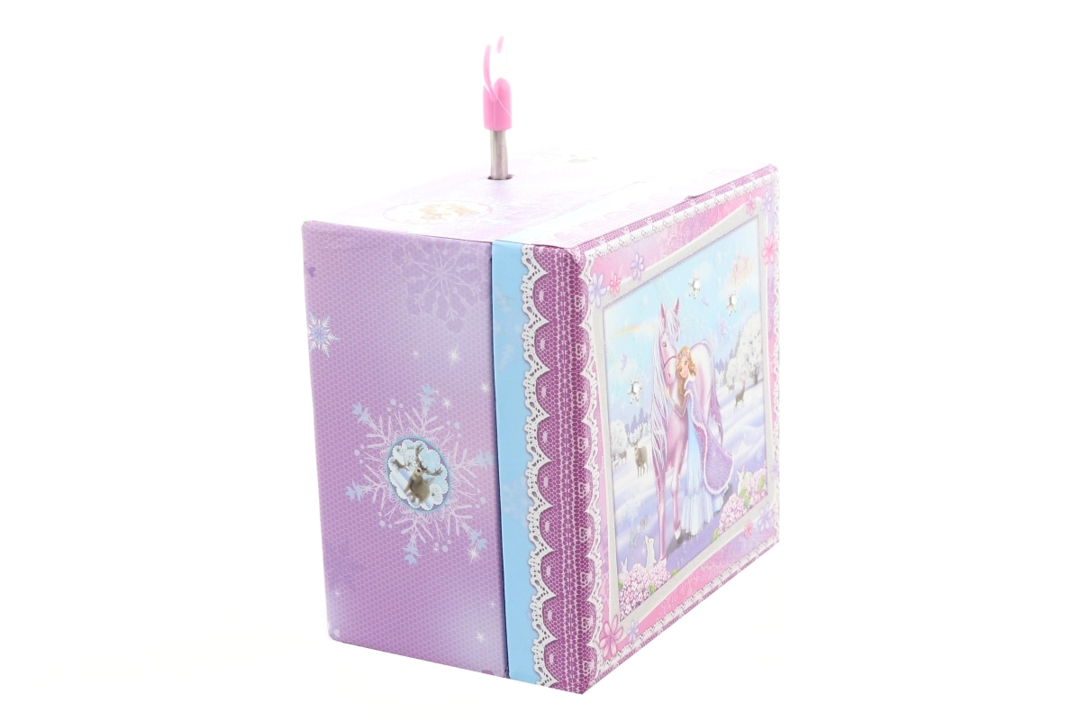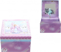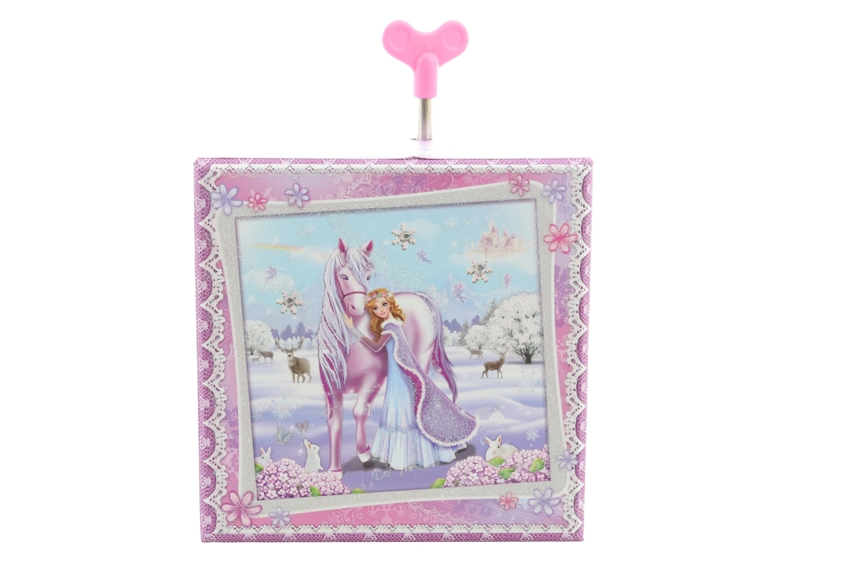 Varázslatos, hercegnős stílusú zenélő ékszerdoboz lóval, amely a mesék kis és nagy rajongóinak is örömet szerez. A kulcs felhúzása után belül megpördül egy egyszarvú, amely táncol és dallamot játszik. Az ékszerdobozban tükör található, és ideális gyűrűk, fülbevalók és apróságok tárolására. Kompakt mérete kb. 11 × 11 × 8 cm, így bármelyik fésülködőasztalra illik.