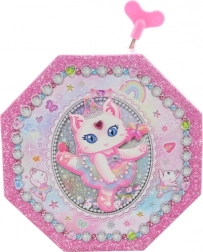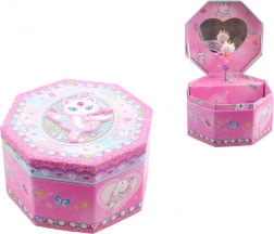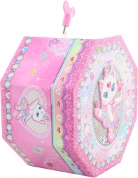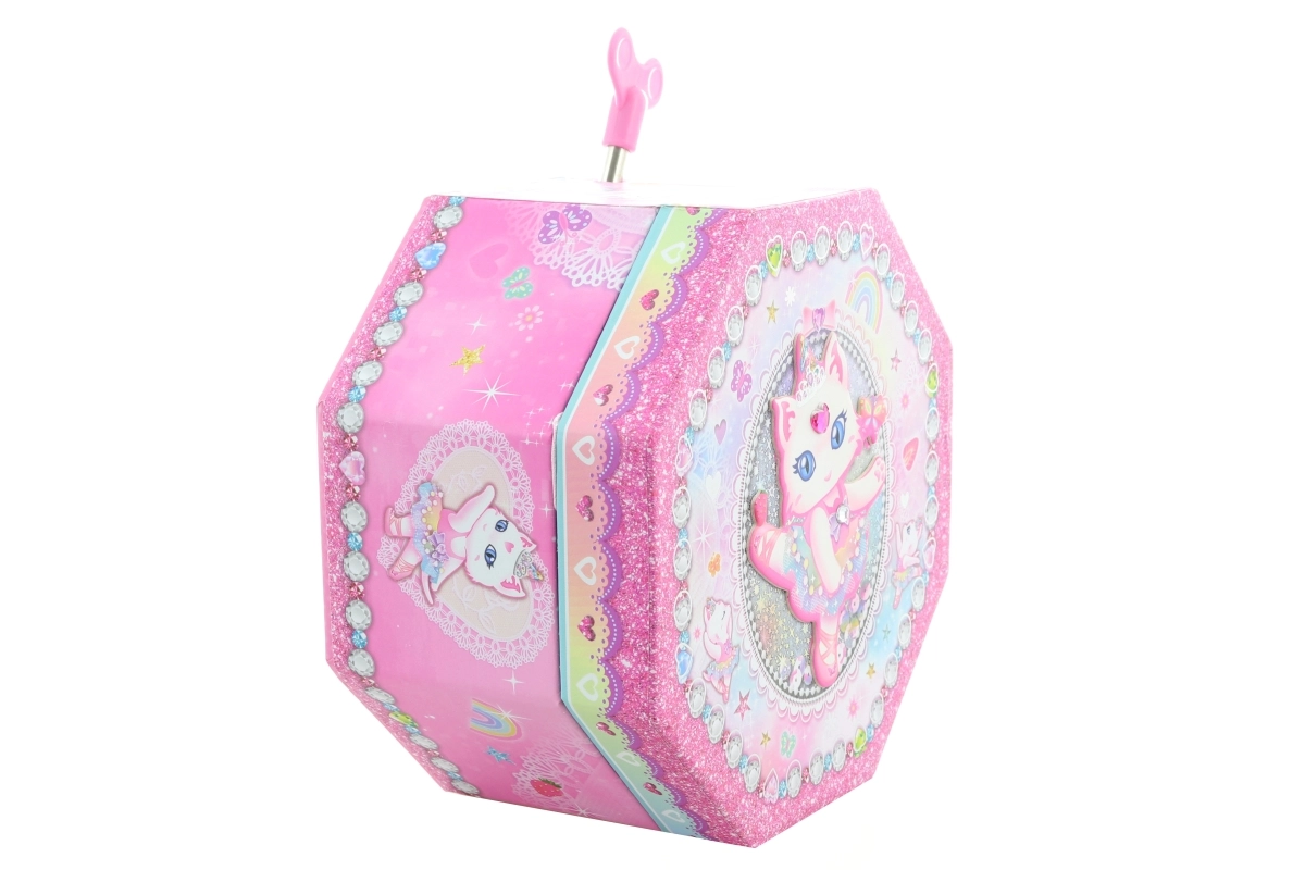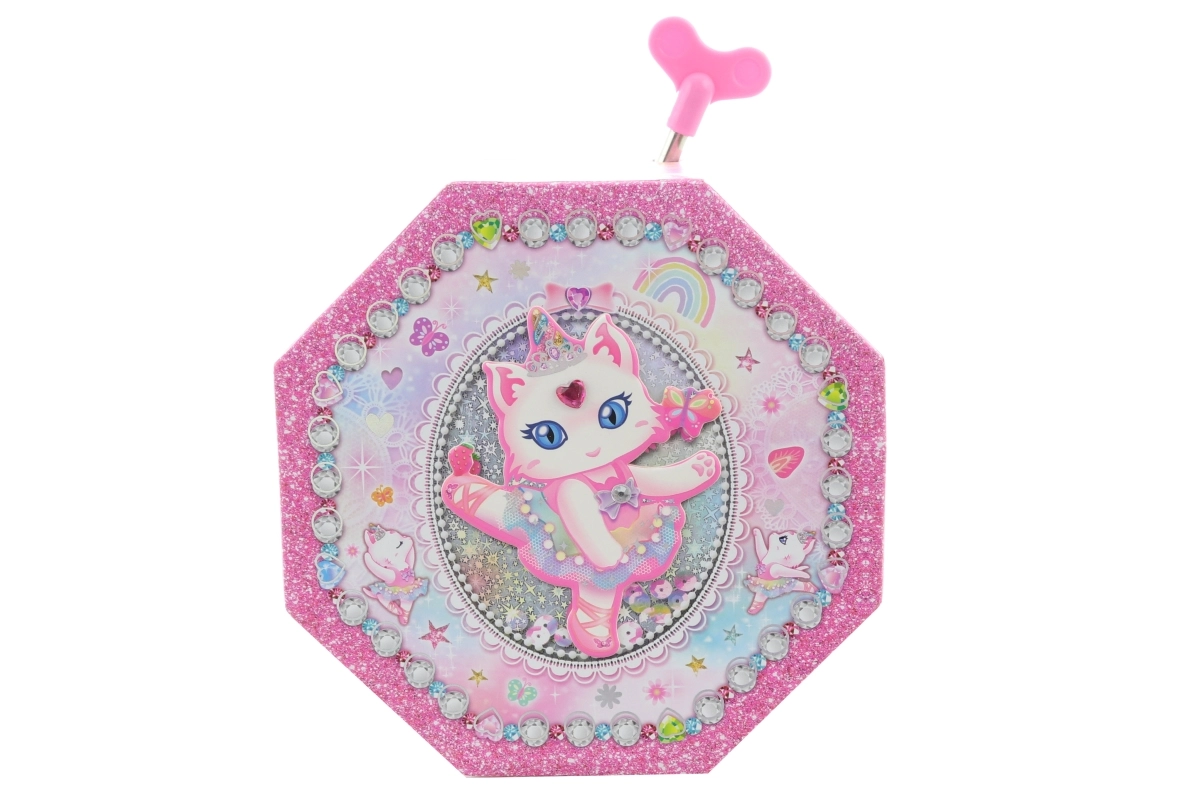 Ez az elegáns rózsaszín zenélő ékszerdoboz bájos megjelenést ötvöz a praktikus tárolótérrel. A mechanikus kulcs felhúzása után a tükör előtt megforgó balerina kíséretében dallam szólal meg, amely minden fedélnyitást különlegessé tesz. Az ékszerdobozt cuki macskás és unikornisos illusztrációk, csillámok és dekoratív kövecskék díszítik.
