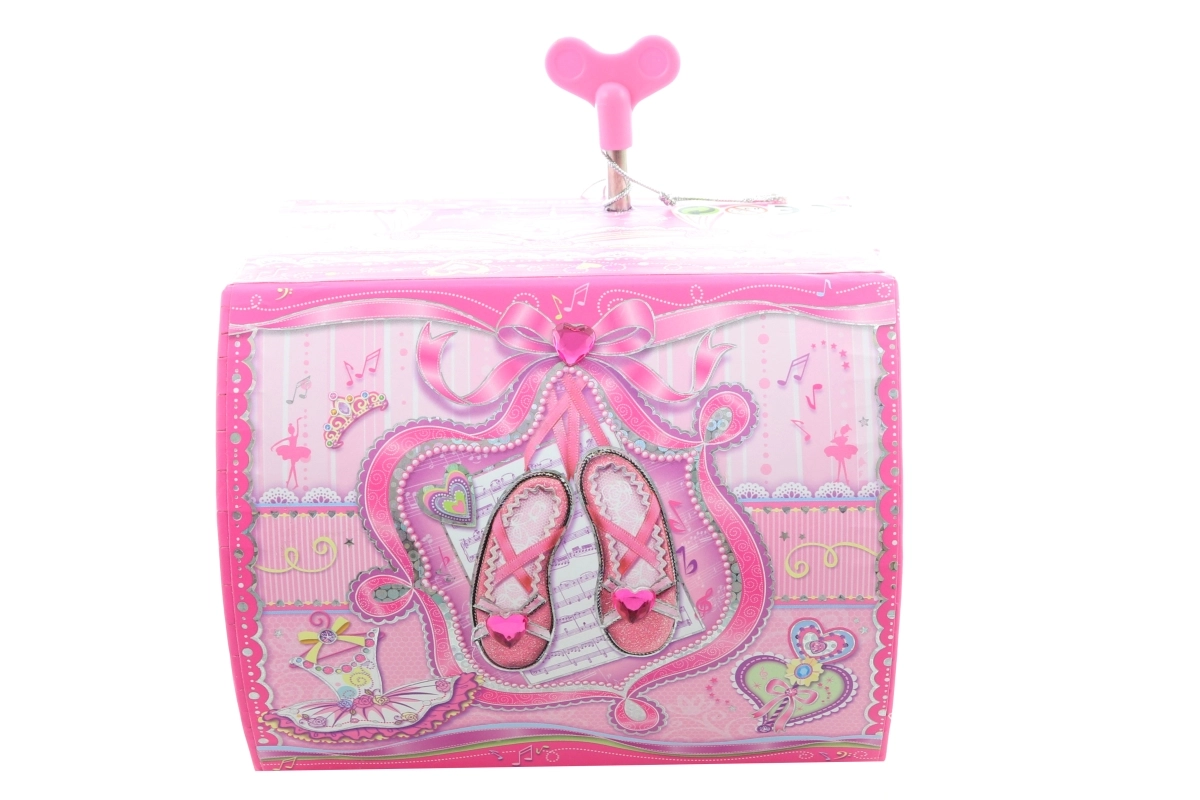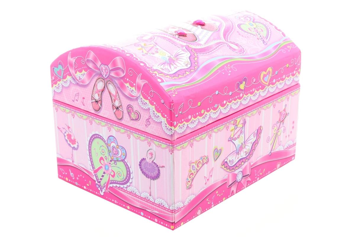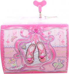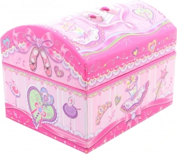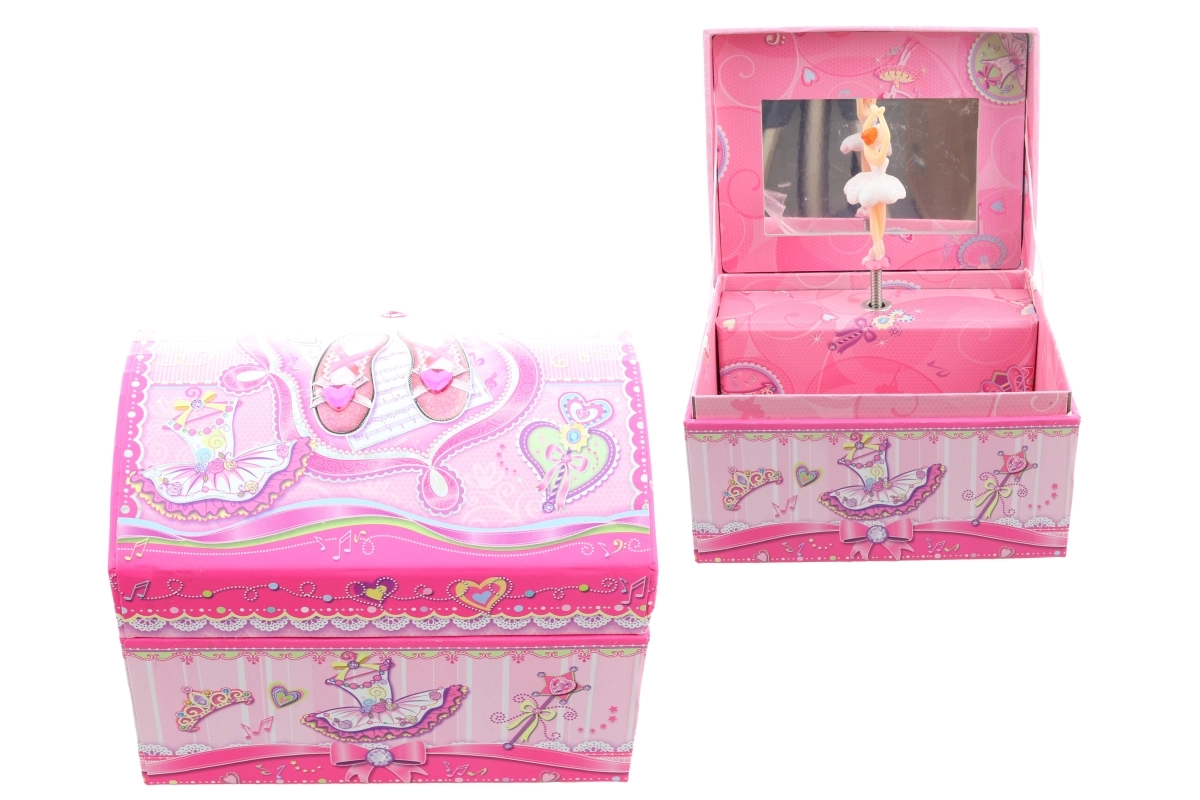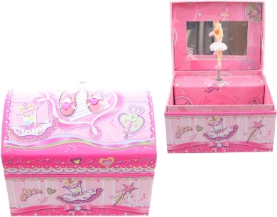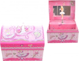 Ez a bájos, ládika formájú ékszerdoboz ideális hely gyűrűk, fülbevalók és egyéb apróságok tárolására. A kulcs felhúzása és a fedél felnyitása után a balerina a tükör előtt forogni kezd, és dallam csendül fel, amely varázslatos hangulatot teremt.