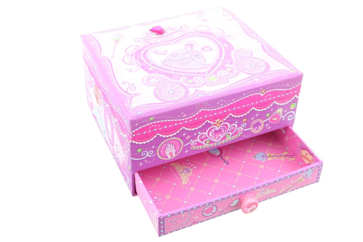 Elbűvölő zenedobozos ékszertartó hercegnős motívummal, amely minden nyitáskor örömet szerez. A kulcs felhúzása után a balerina a tükör előtt forog, és lágy dallam szólal meg, megteremtve a mesés hangulatot. Az ékszerdoboz áttekinthető rendszerezést kínál apró ékszereknek és titkos kincseknek.