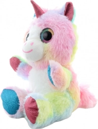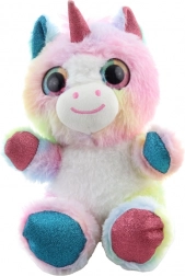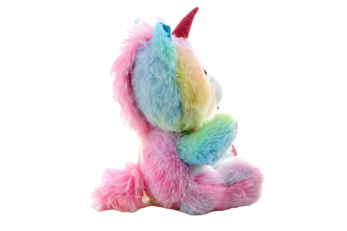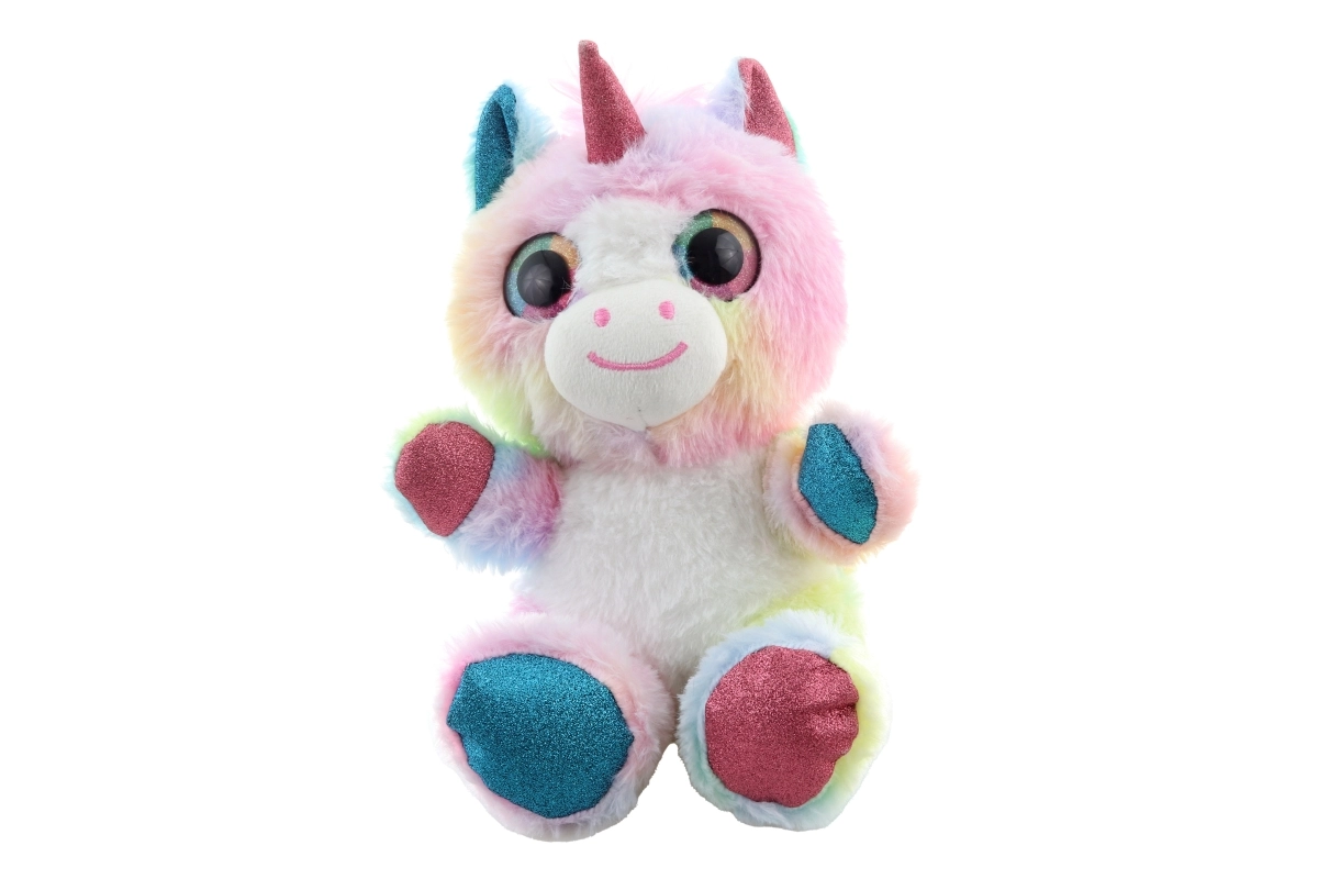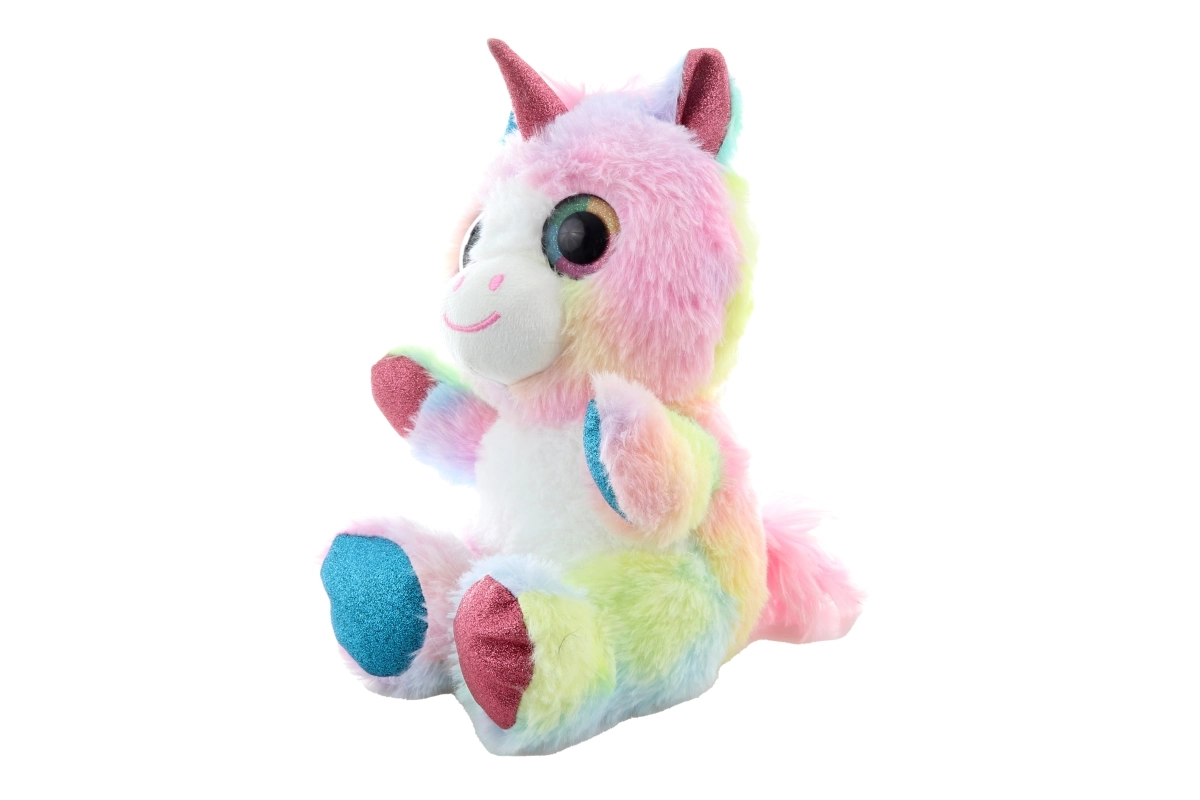Ez a színes plüss unikornis lágy felületével és varázslatos megjelenésével rabul ejti a gyerekek szívét. A pasztell szivárvány árnyalatok, a szarvon, füleken és patákon lévő csillogó részletek, valamint a nagy, hímzett szemek nagyszerű társsá teszik játékhoz és elalváshoz egyaránt.