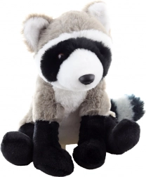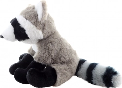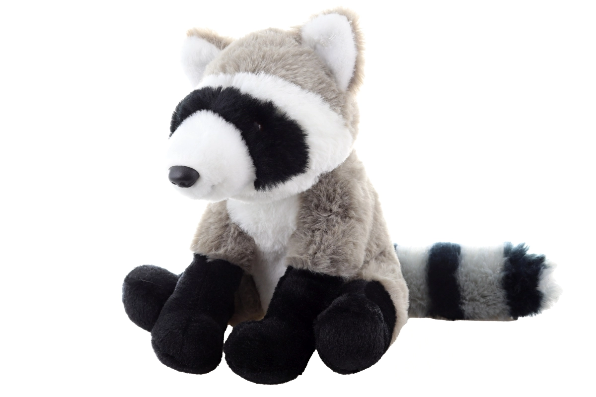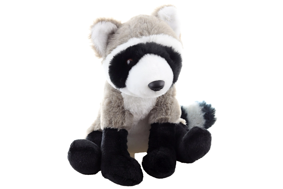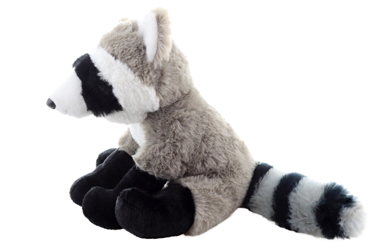 Jellegzetes fekete „maszk”, tappancsok és csíkos farok teszik a játékot bájossá és élethűvé.