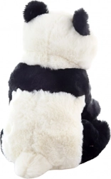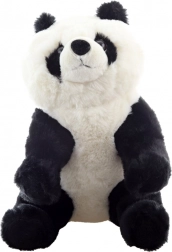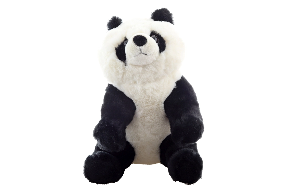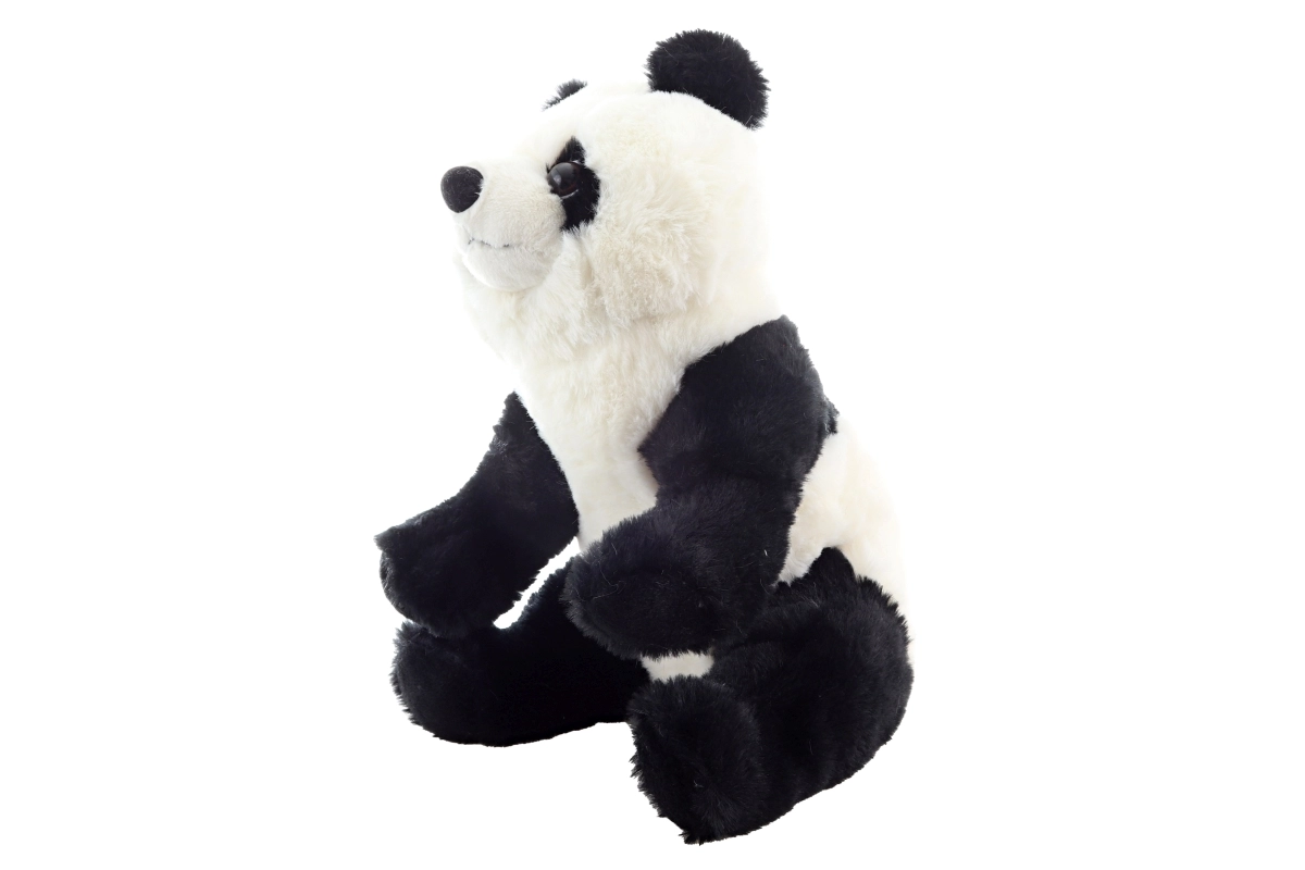 A műanyag szemek, a kerek fülecskék és a precíz varrások élethű megjelenést kölcsönöznek az ülő pozícióban lévő pandának.