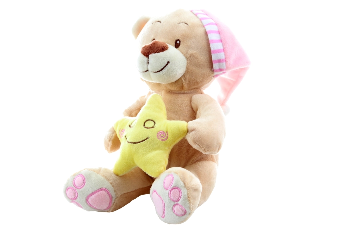 Ez a selymesen puha maci rózsaszín alvós sapkával és tenyérbe simuló, finom sárga csillaggal biztonságérzetet és nyugodt alvást nyújt a gyerekeknek. Minőségi kivitelezésének és hímzett részleteinek köszönhetően újszülötteknek is alkalmas.