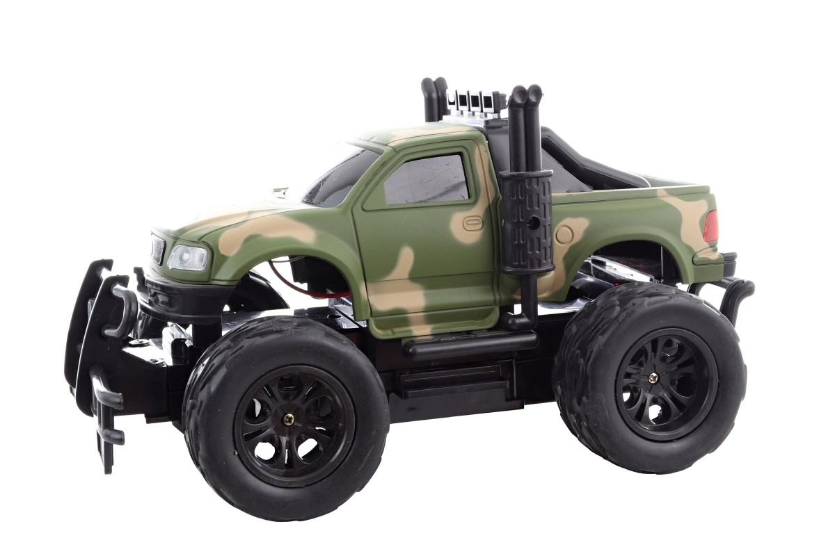 Robusztus, álcázott zöld karosszéria, megemelt rugózás és óriási gumiabroncsok a kisebb egyenetlenségek és a szőnyeg könnyű leküzdéséhez.