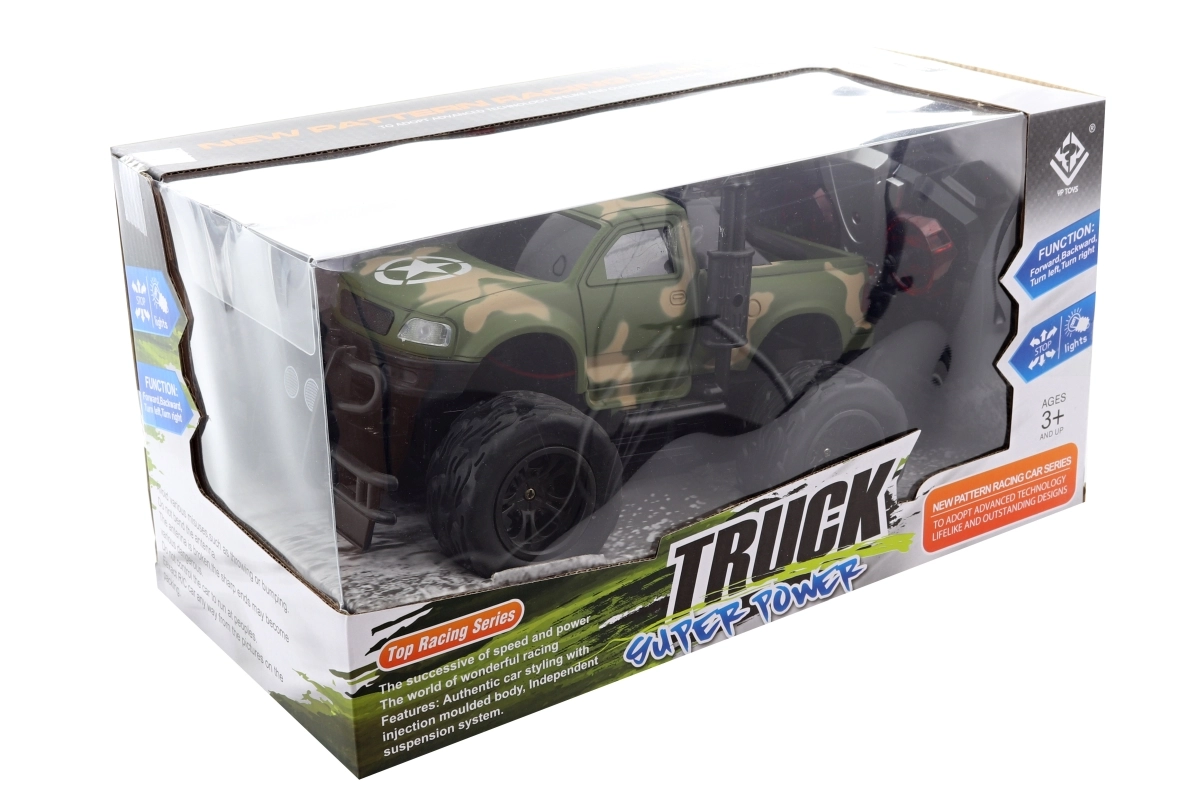 Lépj be az off‑road szórakozás világába ezzel a katonai RC jeep-pel, amely álcázott dizájnjával, megemelt alvázával és robusztus kerekeivel hívja fel magára a figyelmet. Az első lámpáknak köszönhetően félhomályban is látványos a vezetés, az egyszerű távirányítás pedig kezdőknek is remek.