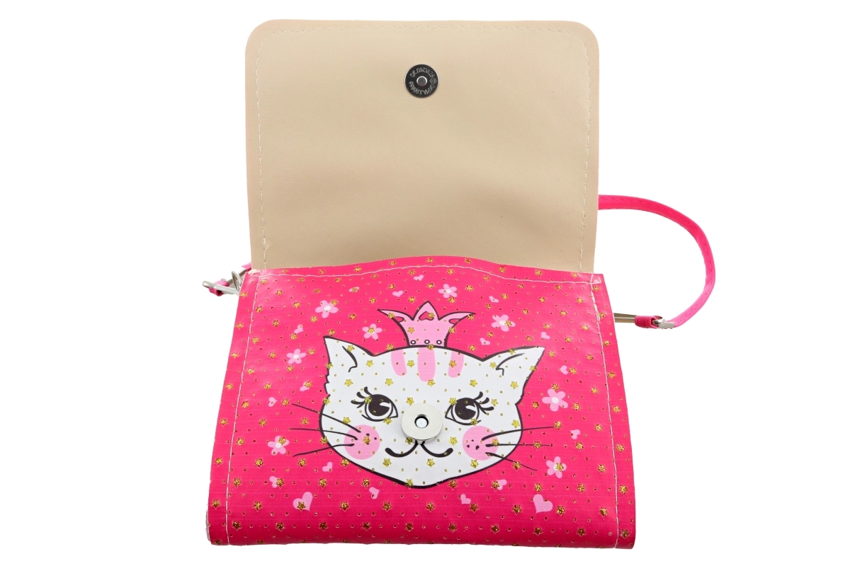 A belső tér okosan van felosztva 2 rekeszre, így a gyermek könnyen rendszerezheti az apróságokat, mint például a zsebkendőt, kis játékokat vagy a kirándulások kincseit. A patentos zárás gyors és biztonságos csukást tesz lehetővé, hogy a tartalom a helyén maradjon. A telt szín és a bájos cica motívum első pillantásra megragadja a figyelmet, és növeli a hordás örömét.
