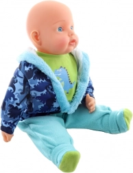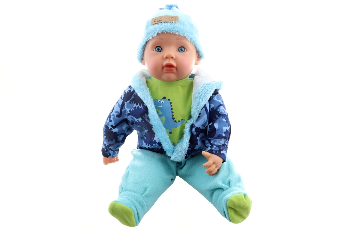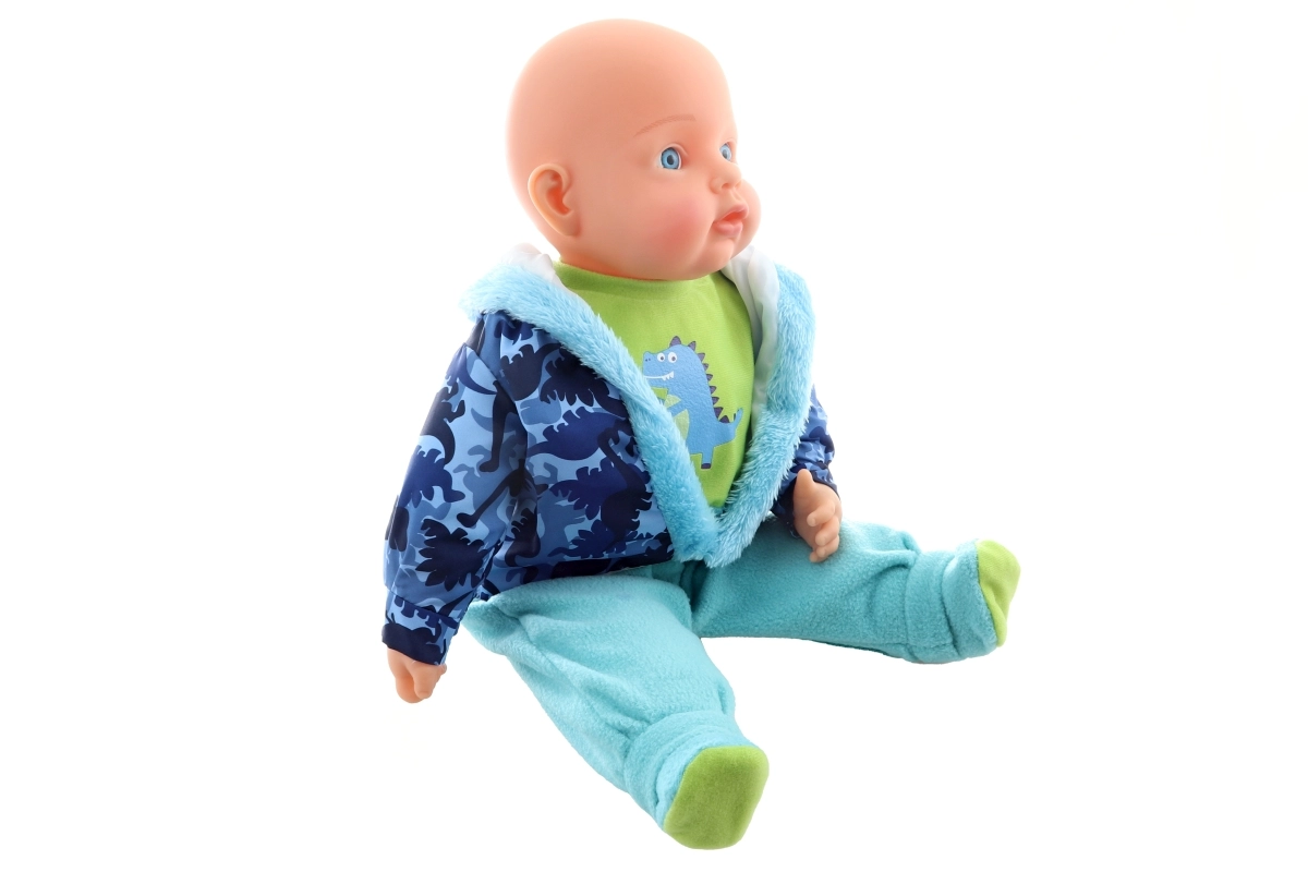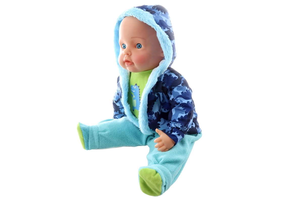Ez a nagy, fiú baba remek társ a mindennapi játékhoz. A puha testecskének köszönhetően kényelmes fogni és ölelni, míg a műanyag fej és végtagvégek élethű megjelenést biztosítanak. A stílusos, dinoszaurusz motívumos ruhaszett egyszerűen levehető és visszaadható – ideális a finommotorika gyakorlásához és a fantáziadús játékhoz.