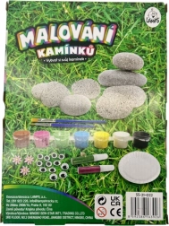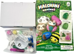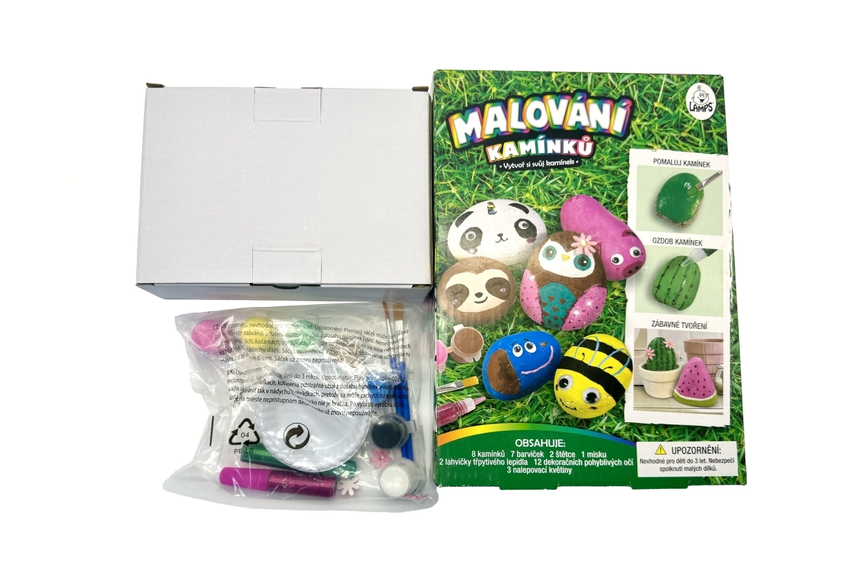 A készlet tartalmaz kavicsokat, festékeket, ecseteket, palettát és díszeket – a gyerekek azonnal elkezdhetnek alkotni, további eszközök beszerzése nélkül.