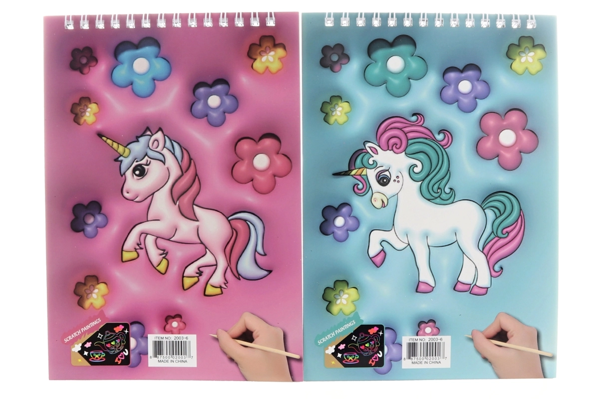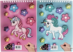 Fedezd fel a rajzolás szórakoztató módját az unikornisos kaparós füzettel. Elég finoman lekaparni a fekete réteget, és alatta élénk színek bukkannak elő, amelyek minden vonást varázslatos képpé alakítanak. A spirálkötésnek köszönhetően az oldalak könnyen lapozhatók, és a füzet jól tartja az alakját.