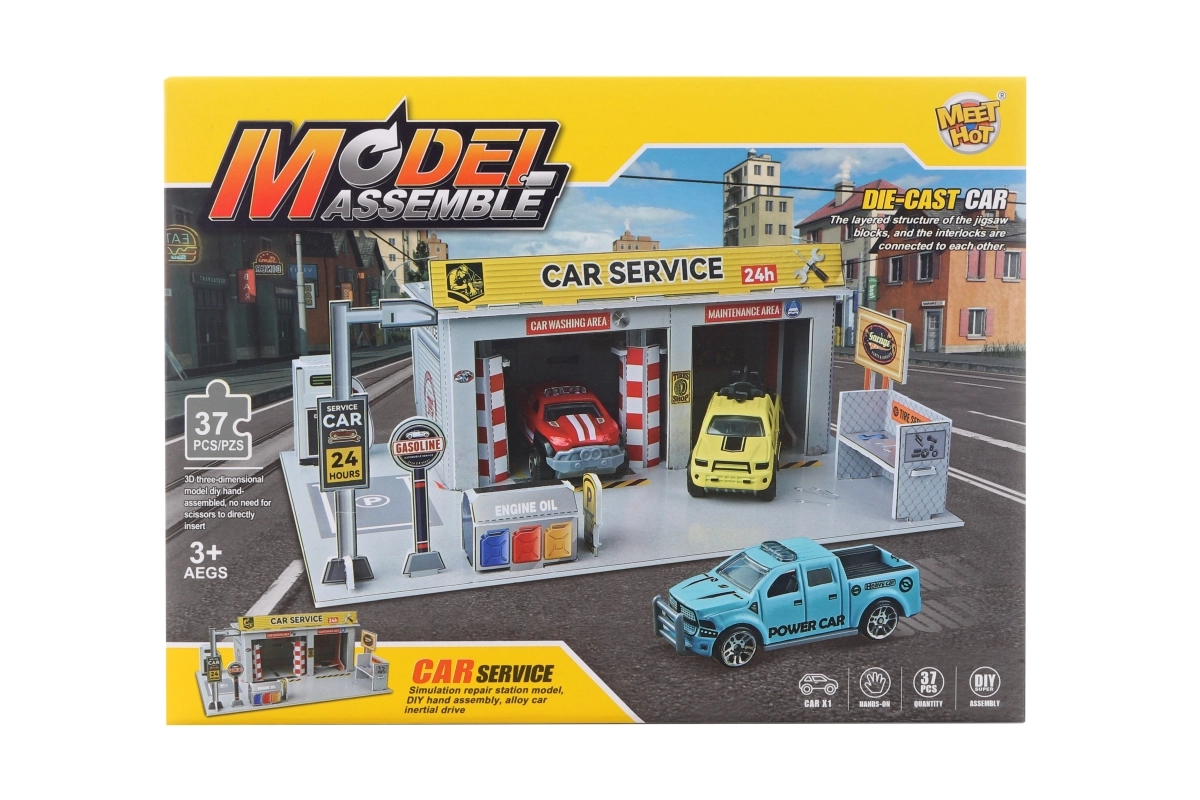 Építsd meg saját autószervizedet, és indulj útnak a fém kisautóval! A készlet puha kartonból készült elemeket tartalmaz a könnyű összeállításhoz, valamint egy fém kisautót az azonnali szórakozáshoz. Ideális 3 éves kortól, fejleszti a finommotorikát, a fantáziát és a türelmet. Az összeállított autószerviz méretei: 20 × 13,6 × 8,3 cm.