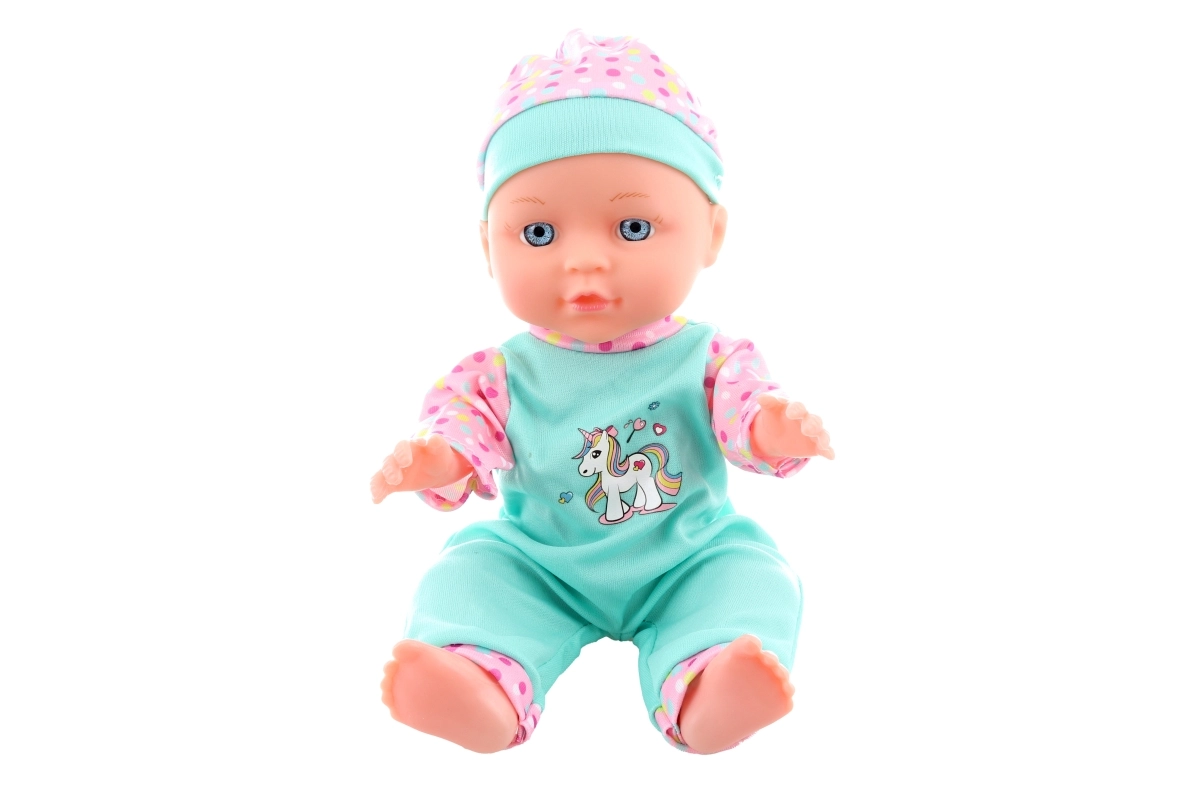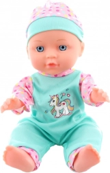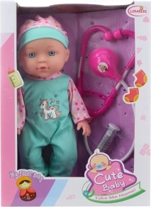 Aranyos, 27 cm-es baba unikornismintás ruhában, amely örömet szerez minden kis gondoskodónak. A készlet része egy sztetoszkóp és egy injekció a doktoros játékhoz. A babának mozgatható kezei, lábai és feje vannak, valamint masszív műanyag teste. Ideális a képzelet fejlesztéséhez és a szerepjátékhoz 3 éves kortól.