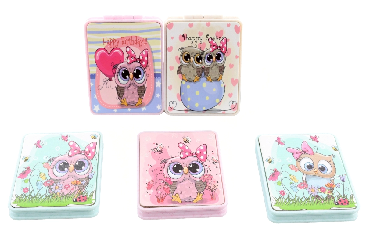 Aranyos, baglyos mintájú zsebtükör, ideális mindennapi használatra kézitáskában vagy hátizsákban. Kompakt méretei, tartós műanyag kivitele és könnyű használata miatt utazáshoz is kiváló. Többféle dizájnban elérhető – raktárkészlettől függően szállítjuk. Tökéletes gyors sminkigazításhoz és praktikus használatra bárhol, bármikor.