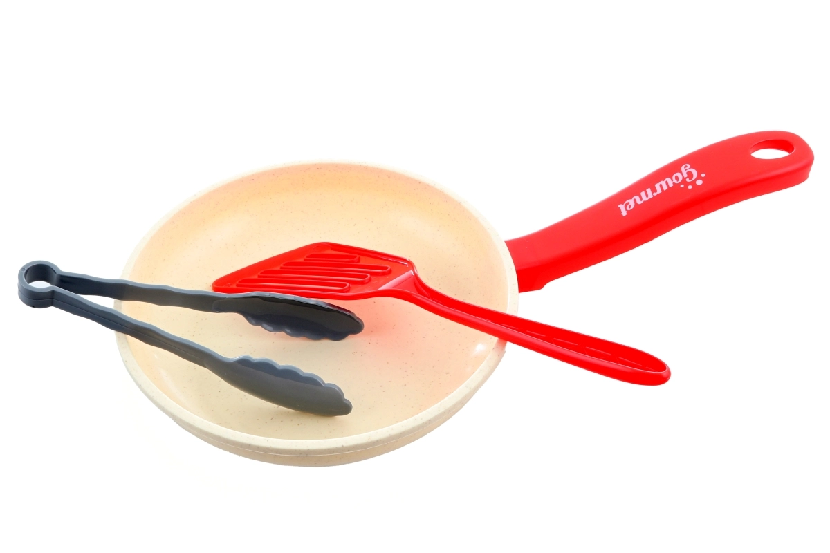 Piros nyelű serpenyő, réselt lapát és csipesz tartós műanyagból, úgy tervezve, hogy könnyen foghatók és biztonságosan használhatók legyenek.