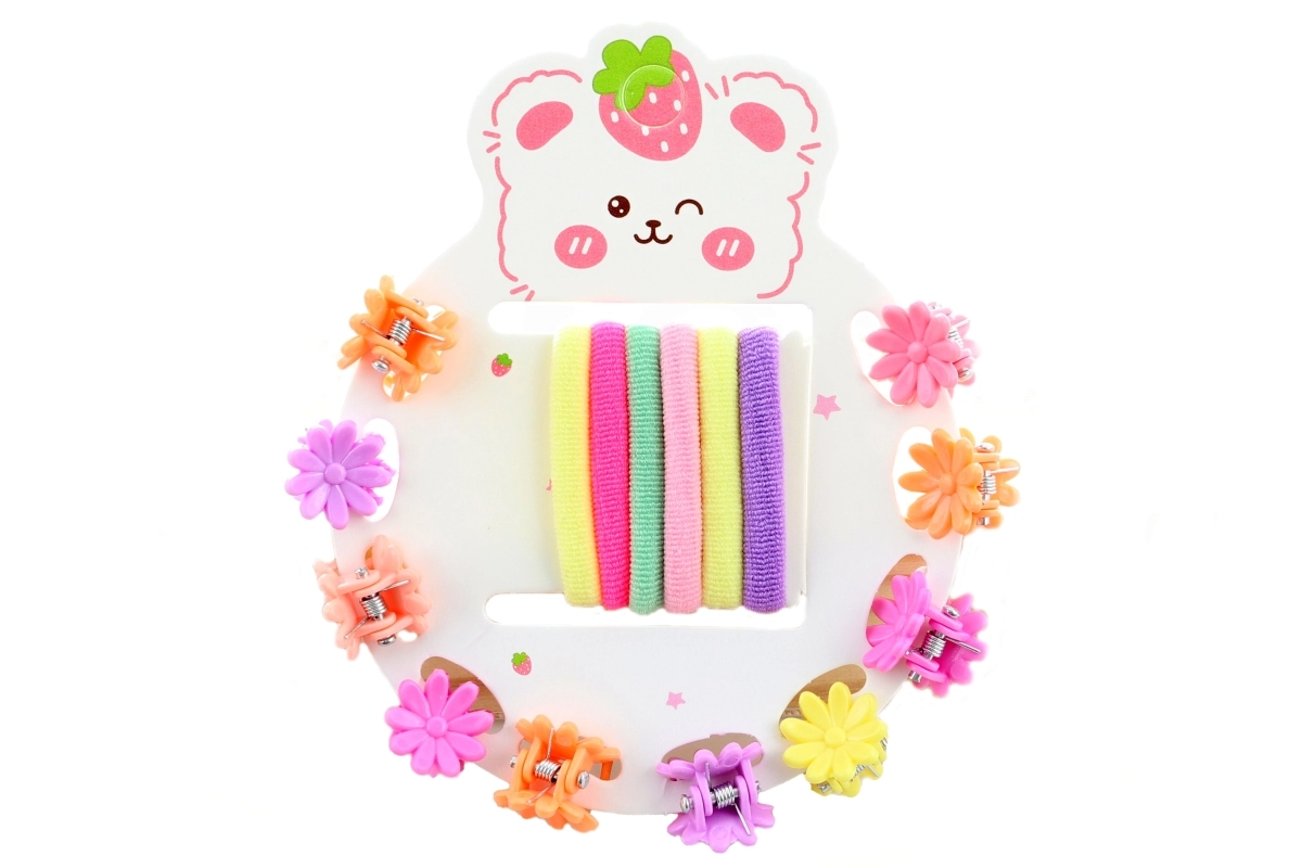 Aranyos hajdísz szett kislányoknak, amely 6 színes hajgumit és 10 virág alakú csatot tartalmaz. Remek a mindennapi viseléshez és különleges alkalmakra is. Könnyű használat, kíméletes a gyerek hajához, és vidám színek a ragyogó frizurákért.