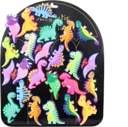 Vidám dinoszaurusz mintás mágnesek, amelyeknek a gyerekek és felnőttek egyaránt örülnek. Minden mágnes körülbelül 5 × 5 cm, puha műanyagból készült, és dekorációs célokra szolgál.