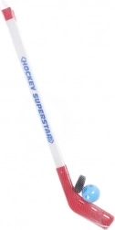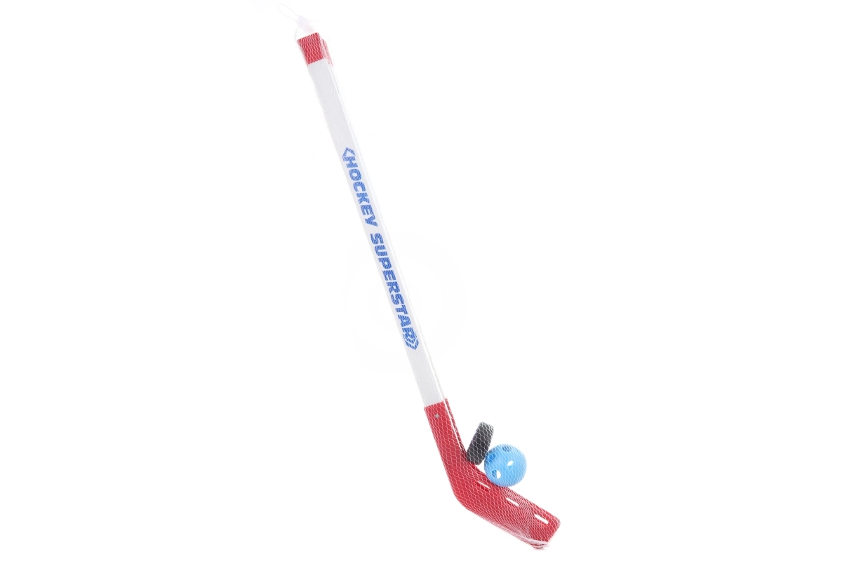 Szórakoztató készlet kis hokisoknak: két könnyű műanyag hokibot, korong és labda otthoni és szabadtéri játékhoz. Ideális 3 éves kortól, a bot hossza kb. 75 cm, praktikus hálós csomagolásban.