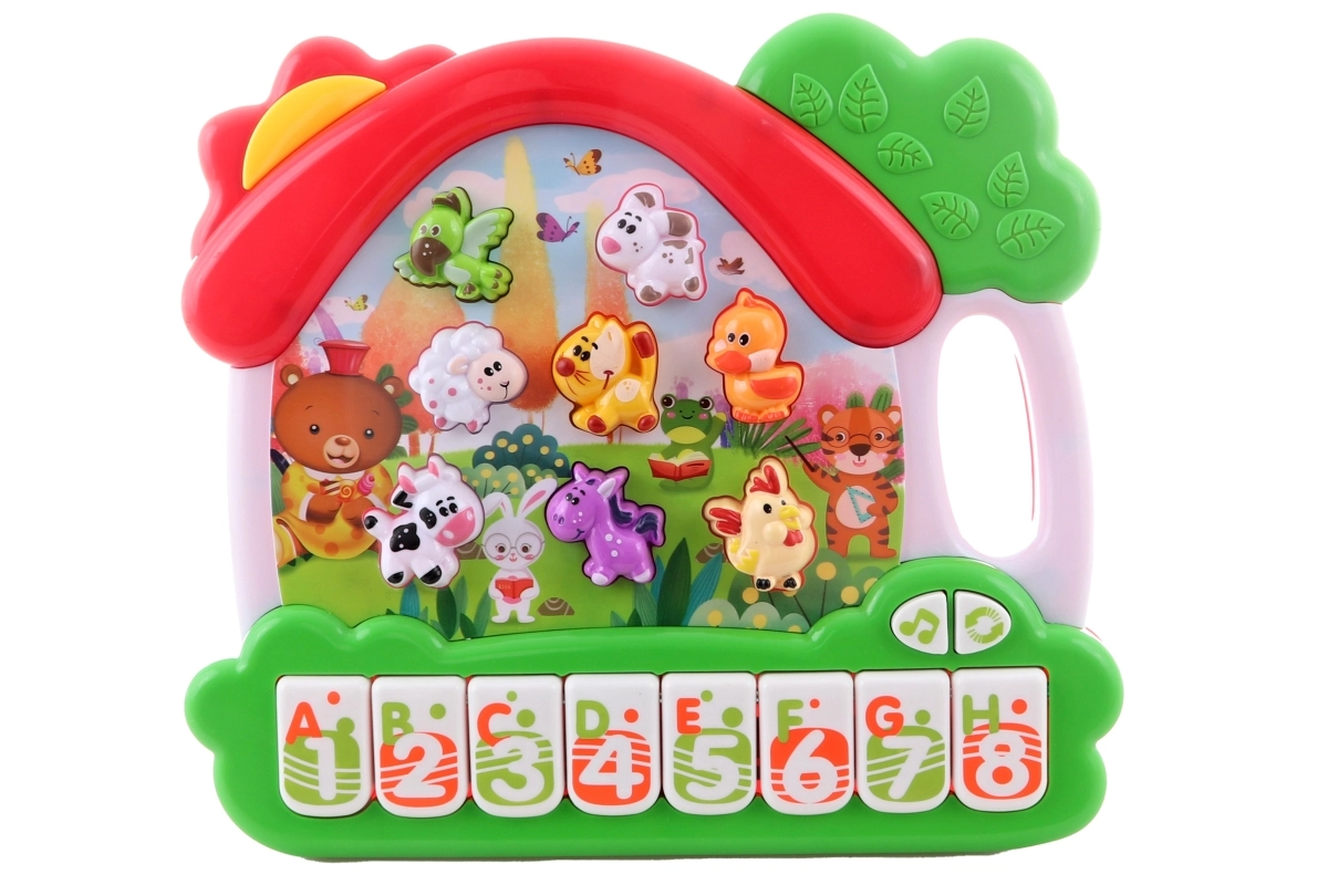 A házikó alakú, szórakoztató gyerekzongora a 3 éves kortól ajánlott kis zenészek kedvence lesz. 8 állathang gombot és 8 számos gombot angol kiejtéssel kínál, így fejleszti a zenei hallást és a nyelvi készségeket. Könnyű műanyag kivitel, egyszerű kezelhetőség és kompakt méret az otthoni és útközbeni játékhoz.