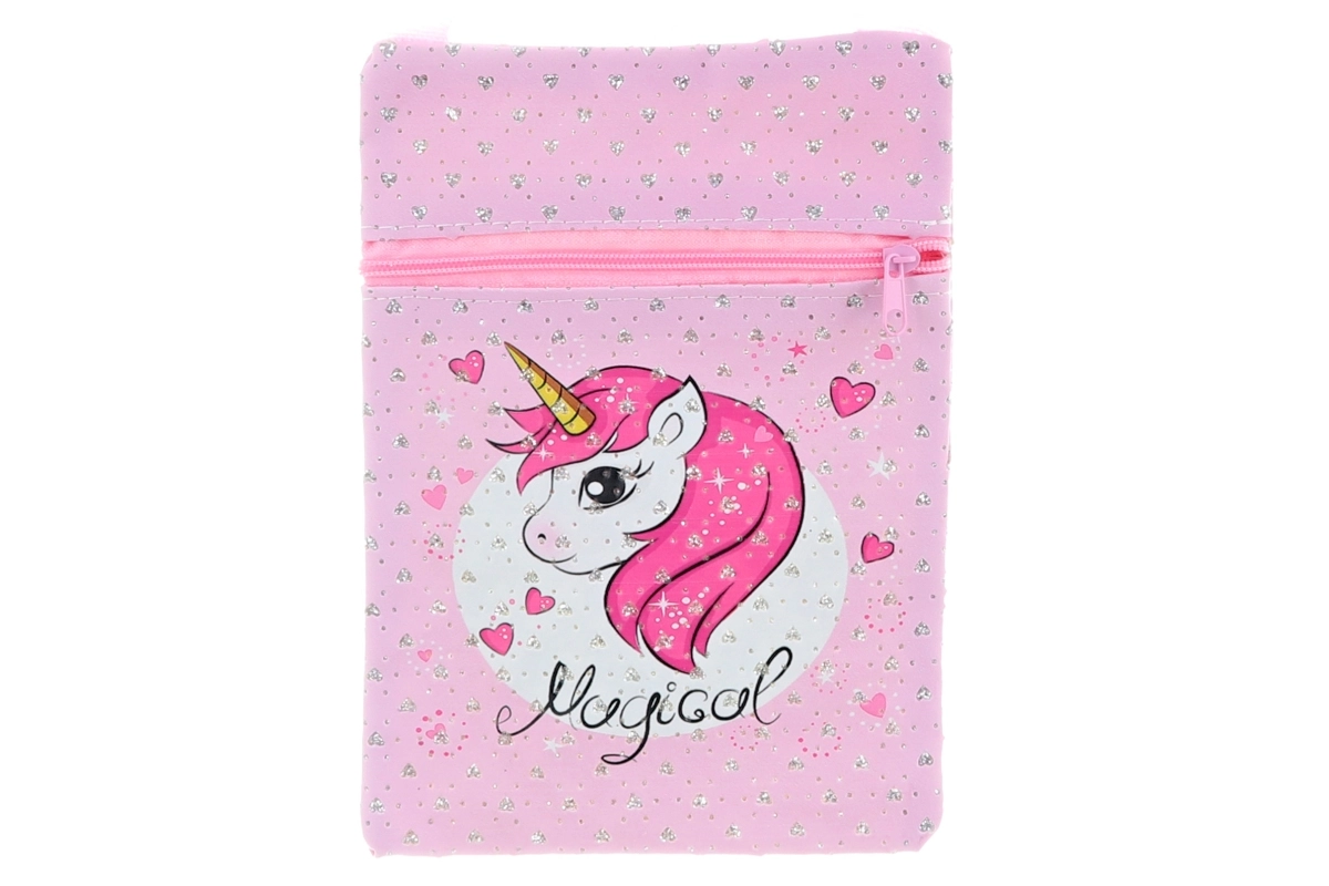 Stílusos válltáska bájos egyszarvú motívummal, amely a fantázia kicsi és nagy rajongóinak is örömet szerez. Kínál praktikus cipzáros zsebet, kényelmes pántot és kompakt méreteket, ideális apróságokhoz.