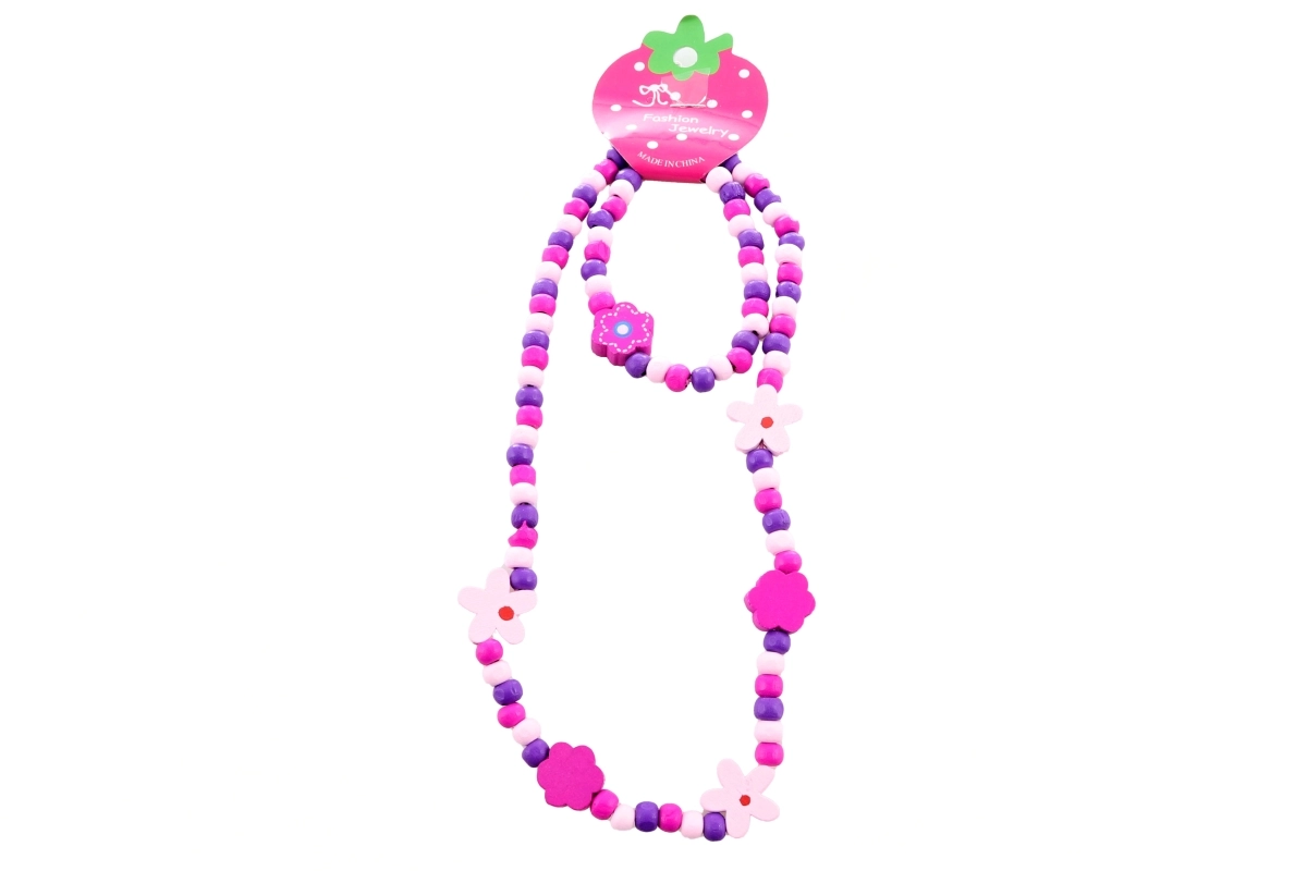 Ez a finom szett egy nyakláncból és egy karkötőből áll, minőségi, színes fa gyöngyökből virágmintával. A rugalmas gumi könnyű felhúzást és kényelmes viselést biztosít csat nélkül. Remekül kiegészíti a gyerekruházatot, és növeli az öltözködés örömét.