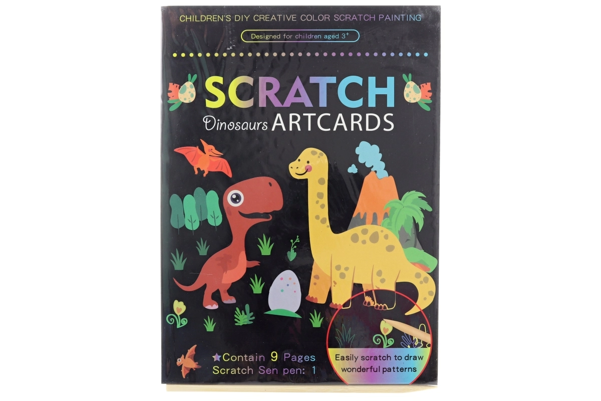 Fedezd fel a kreatív szórakozást dinoszaurusz motívumú kapargatós képekkel. A csomag tartalma 9 kép és egy fa kaparóeszköz az egyszerű kaparáshoz. Minden kép mérete 14 × 19 cm. Ideális relaxációhoz, a finommotorika fejlesztéséhez és dekorációhoz. A termék nem játék.