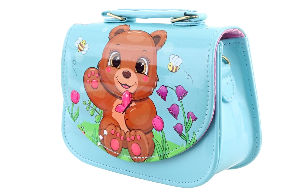Cuki gyerek kézitáska világoskék színben macis motívummal, amely örömet szerez a kis parádésoknak. Fényes, könnyen tisztítható felület, praktikus patentos záródás és egy fő rekesz az apróságoknak. A 18 × 14 × 7 cm kompakt méret ideális zsebkendőnek, kis játékoknak vagy kiegészítőknek. A termék nem játék.