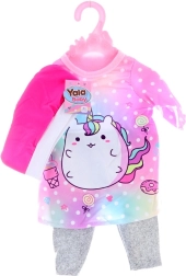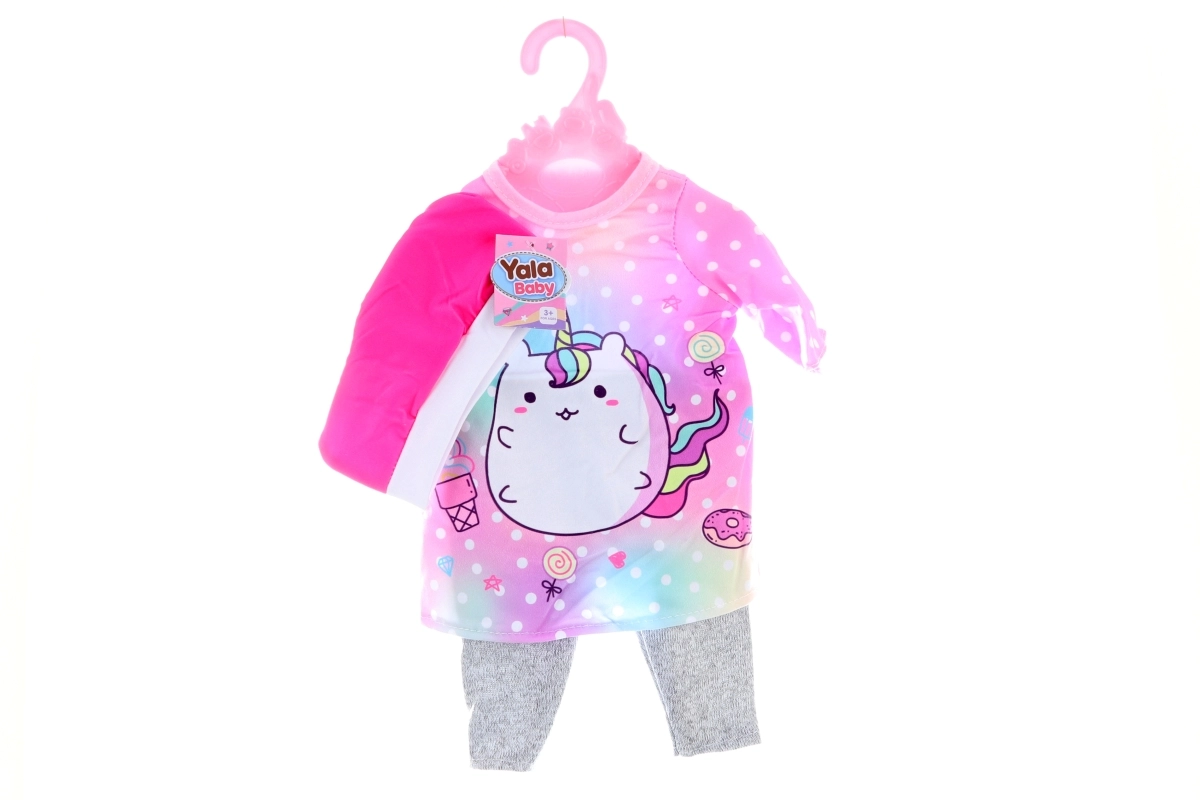 Aranyos babaruha szett, amely nadrágból, pólóból és sapkáiból áll. Tökéletes mindennapi játékhoz és a babák öltöztetéséhez. A ruhácska vállfán, tasakban érkezik, így azonnal használatra kész és könnyen tárolható.