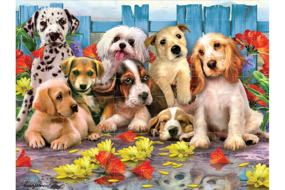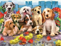 Színes illusztráció tele kiskutyákkal és virágokkal, amely örömet okoz gyerekeknek és felnőtteknek egyaránt, és újra meg újra kirakásra csábít.
