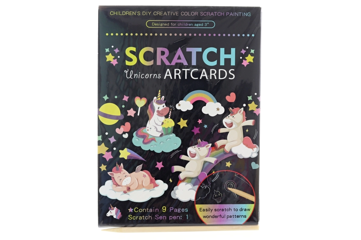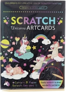 Ez a kreatív készlet szórakoztató kaparást kínál a népszerű unikornis motívummal. A mellékelt fa eszközzel finoman felfedheti a színes rétegeket, és látványos képeket hozhat létre, melyek kiállításhoz vagy ajándékozáshoz is ideálisak.