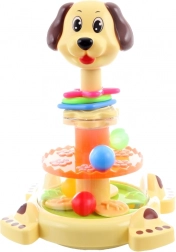 Ez a bájos, kutyusos pörgettyű minden kis felfedezőnek örömet okoz. A fej egyszerű lenyomásával a mechanizmus aktiválódik, és a belső, színes golyók megpördülnek. A játék támogatja a szem–kéz koordinációt, és segít megérteni az ok-okozati összefüggéseket.