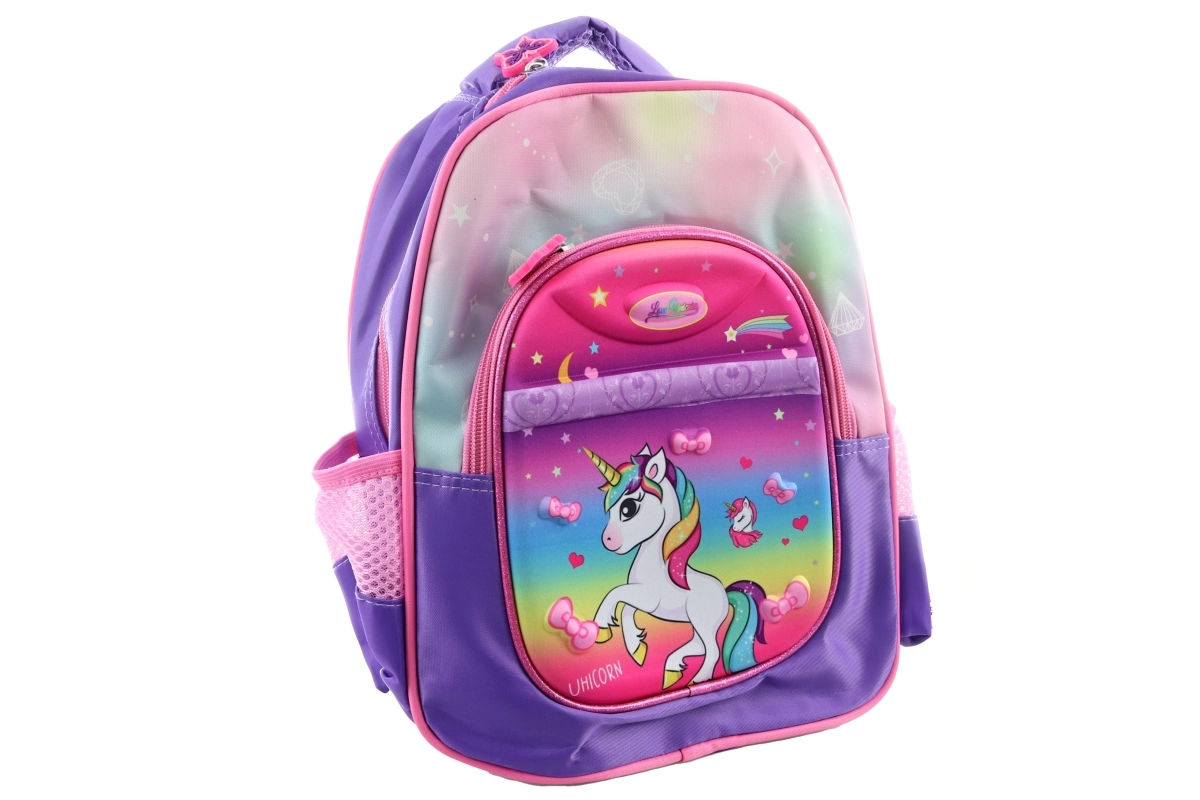Könnyű gyerek hátizsák egyszarvú mintával pasztellszínekben, amely örömet szerez minden kisiskolásnak és óvodásnak. Formázott elülső panellel, praktikus oldalsó hálós zsebekkel a kulacsnak és elülső cipzáras zsebbel az apróságoknak. A párnázott, állítható pántoknak köszönhetően egész nap kényelmesen hordható.
