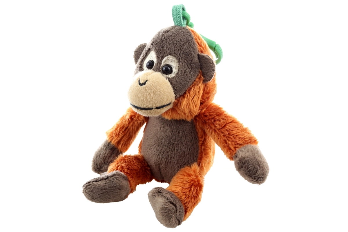 A zöld klip lehetővé teszi, hogy az orangutánt gyorsan a hátizsákra, babakocsira vagy kulcsokra csíptesd – mindig kéznél, játékra készen.
