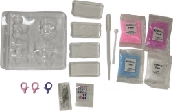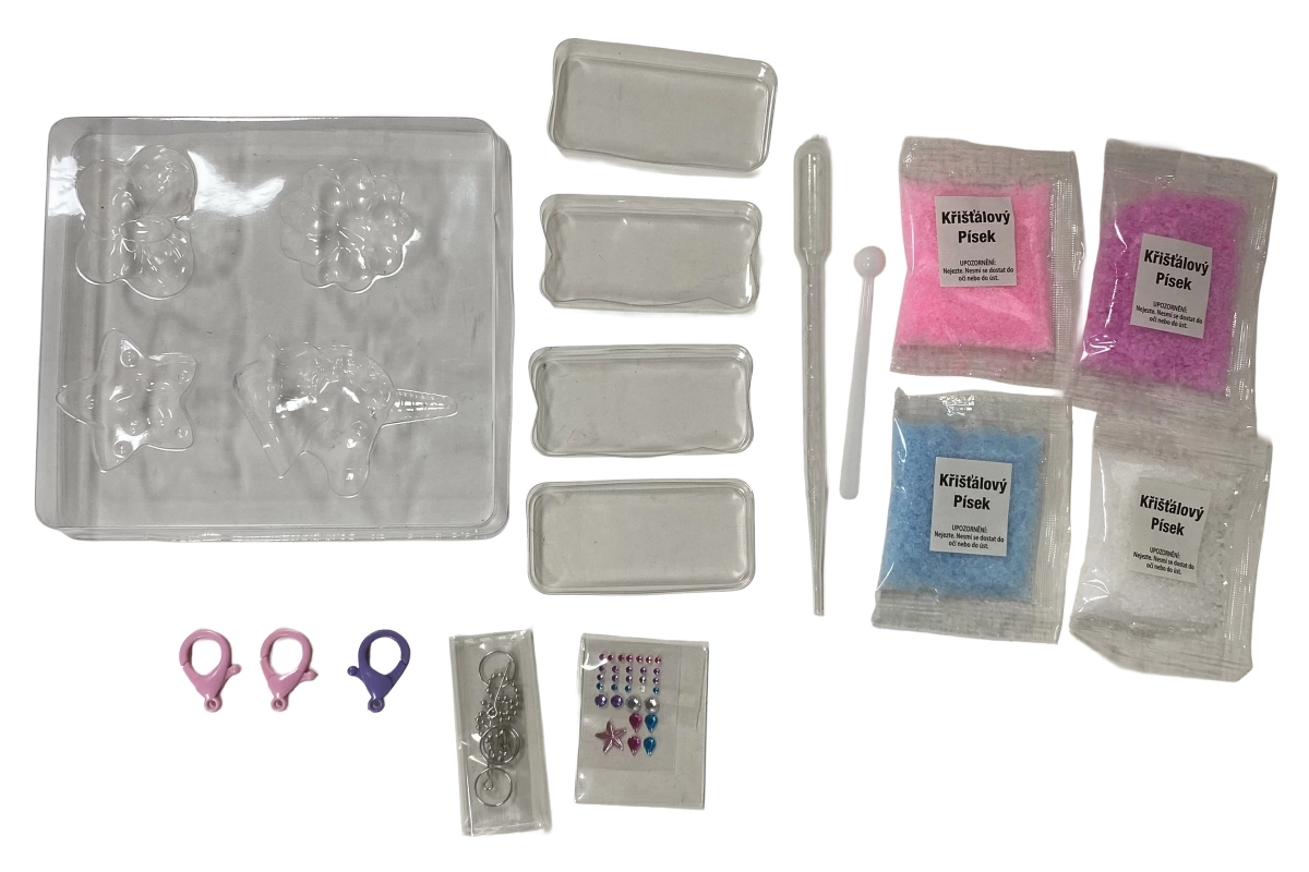 - Homok, forma, kanál, pipetta, öntapadós drágakövek, karabinerek, karikák, fém gombostűk, golyós lánc, tégelyek