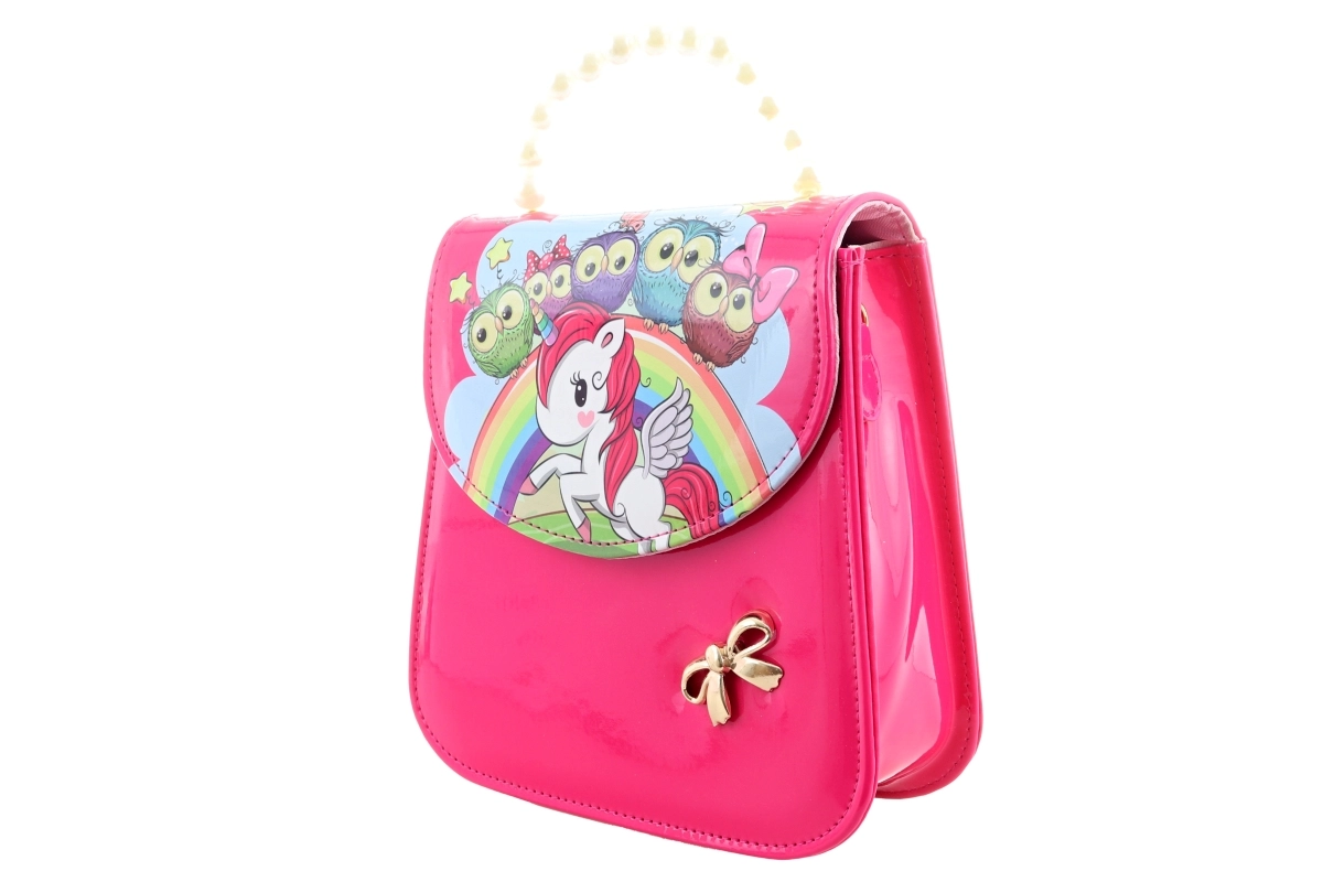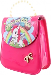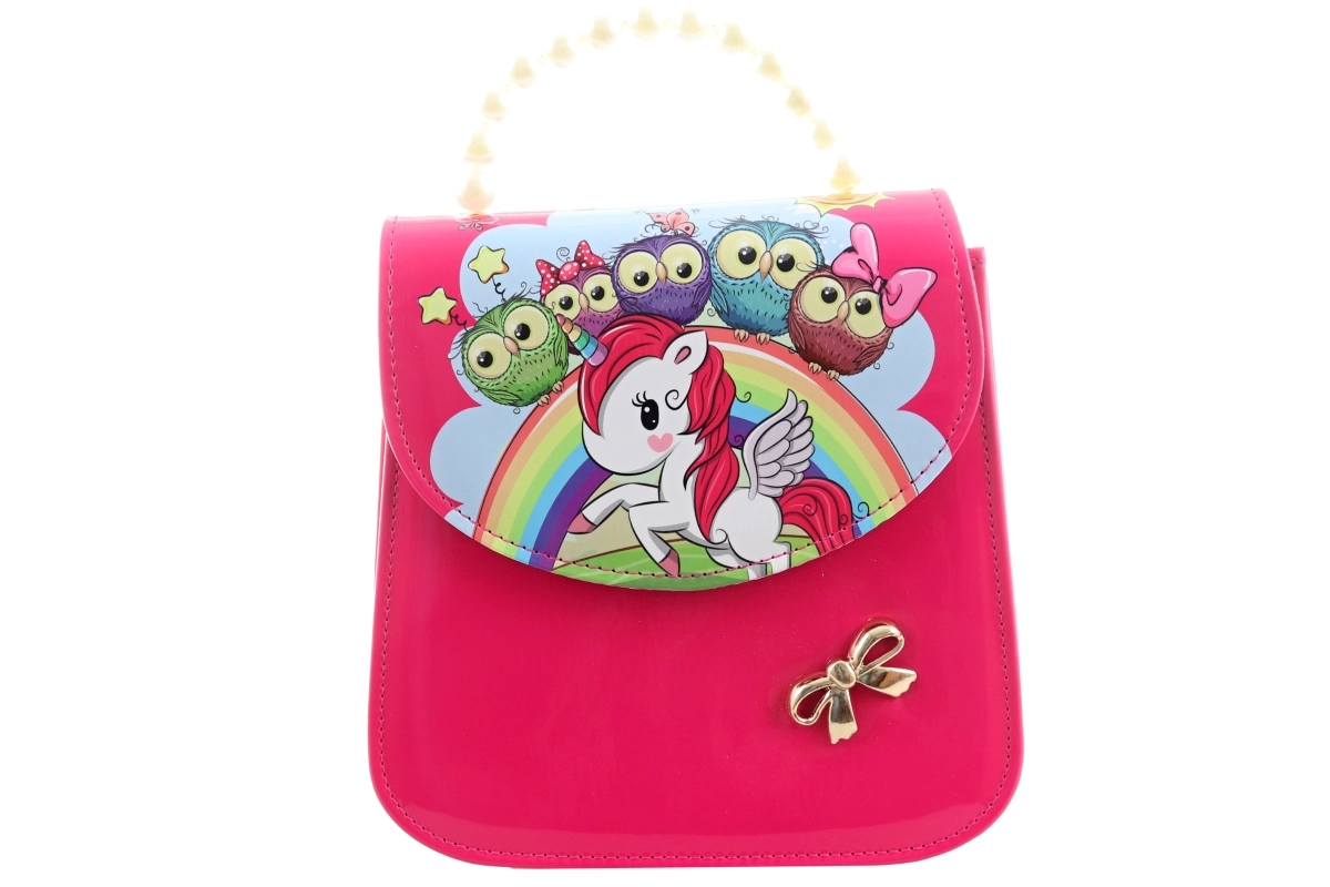 Ez a stílusos rózsaszín táska színes unikornis-, szivárvány-, csillag- és bagoly mintával azoknak a gyerekeknek készült, akik szeretik a játékos dizájnt, és a kincseiket mindig kéznél szeretnék tartani. A fényes felület könnyen tisztán tartható és elegáns hatást kelt.