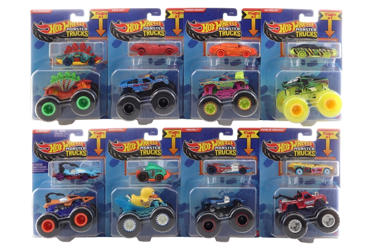Fedezd fel a szörnyen jó szórakozás világát a Hot Wheels Monster Trucks 1:64 méretarányú járgányaival. Minden truck masszív fémből készült, feltűnő dizájnnal bír, és készen áll az ütközésekre, ugrásokra és zúzós becsapódásokra. A csomag része továbbá a világhírű Hot Wheels 1:64 kisautó is, még több játékvariációért.