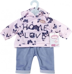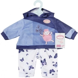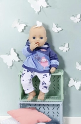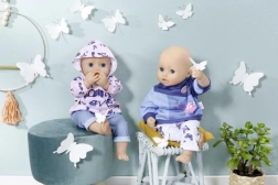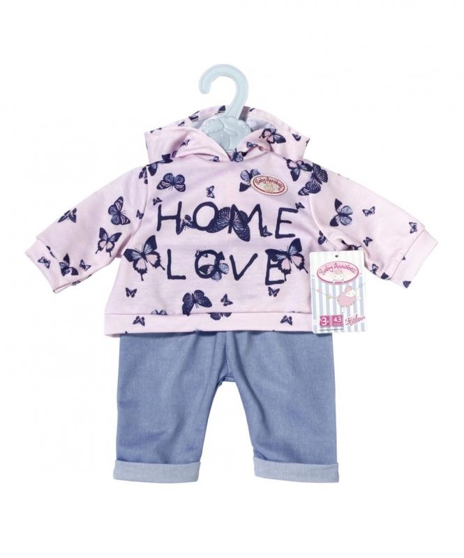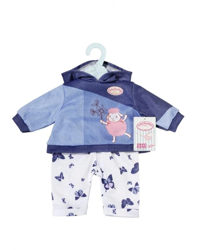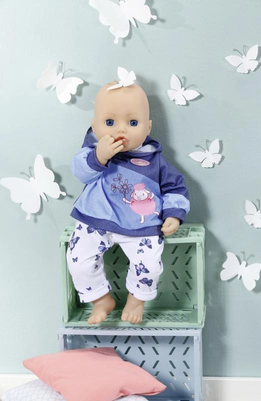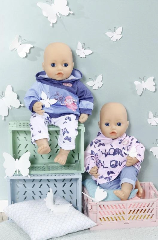 Kényeztesd BABY ANNABELL babádat egy otthonos szettel. A csomag két különböző megjelenést kínál: rózsaszín kapucnis pulcsi finom lepkékkel és farmer stílusú nadrág, vagy kék kapucnis pulcsi aranyos mintával és kényelmes sportnadrág. Az anyagok puhák és kellemes tapintásúak, ideálisak a mindennapi játékhoz.