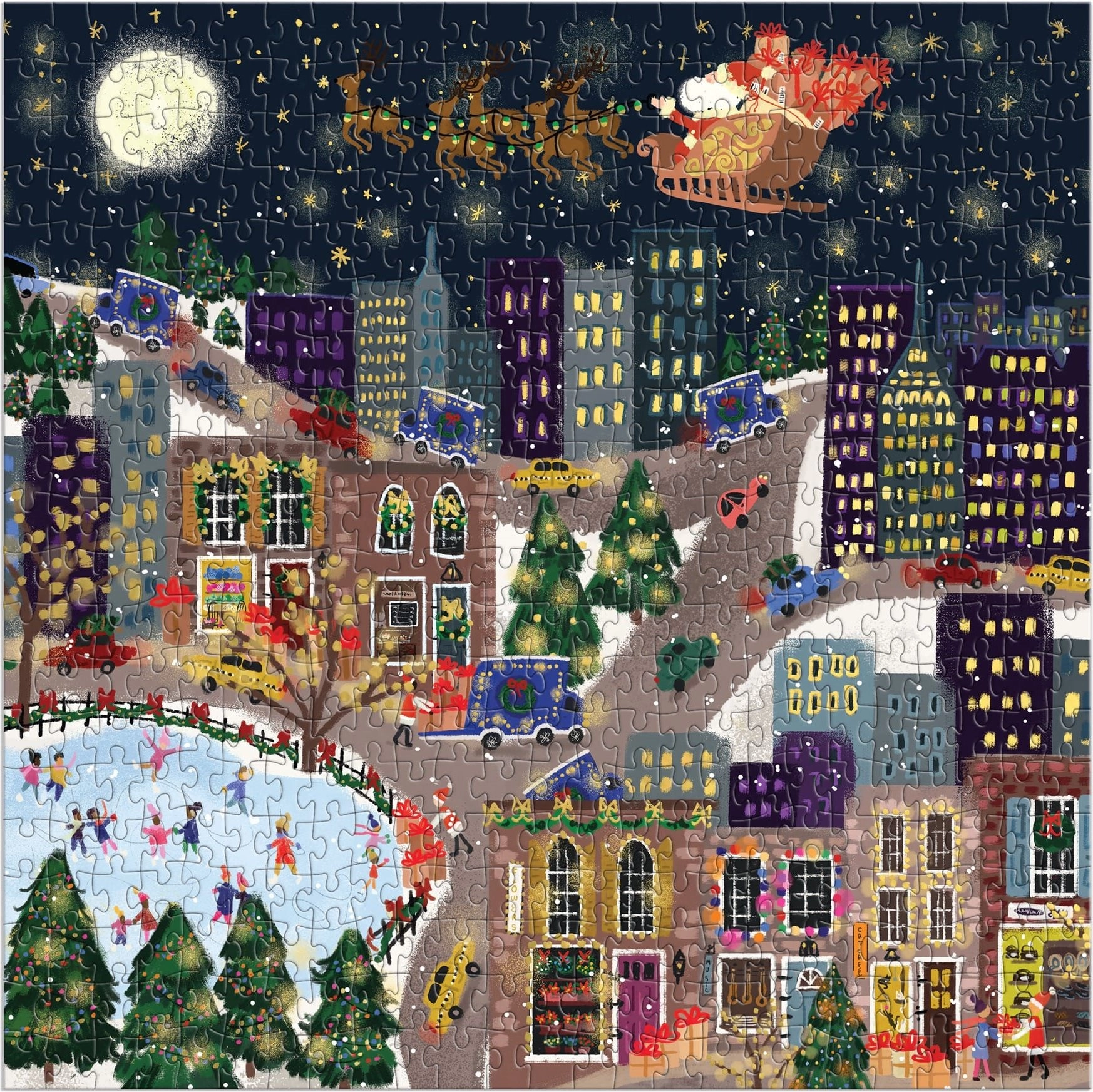 A GALISON fémes, négyzet alakú kirakója Ajándékváros motívummal a minőségi nyomtatást, a precízen vágott darabokat és a vonzó fényhatást ötvözi. A négyzetes formátum remekül mutat falon és polcon egyaránt, és örömet szerez kezdőknek és gyakorlott kirakóknak is.