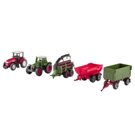 Ez a sokoldalú Siku Farmer készlet autentikus élményt nyújt a mezőgazdasági technika világából. Tartalma: MASSEY FERGUSON 9240 traktor, FENDT FAVORIT 926 traktor, erdészeti utánfutó forgó és billenő rakodódarúval, piros billenőplatós KRAMPE és kéttengelyes utánfutó. A precíz kivitel és funkcionális részletek támogatják a kreatív játékot és a finommotorika fejlesztését.