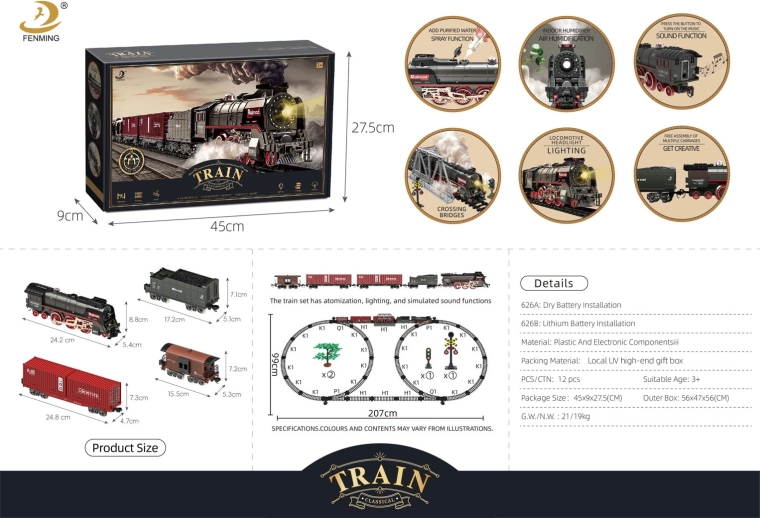 A menet testre szabható – a vonat előre, hátra halad és megáll, szükség esetén kikapcsolható a hang. A 3,7 V 1200 mAh kapacitású tölthető akkumulátor kényelmes működést biztosít gyakori elemcsere nélkül. Az összeállított pálya mérete megközelítőleg 207 × 99 cm, így bőven ad teret a kreatív játéknak.