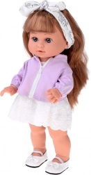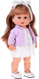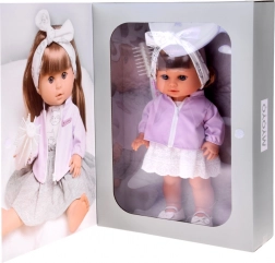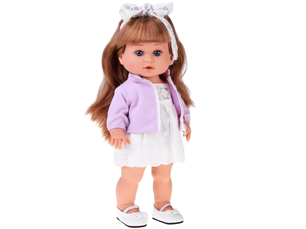 Fedezze fel a bájos, 38 cm magas, hosszú hajú babát, amely elvarázsolja a kis fodrászokat és a divatkedvelőket. Valósághű arcvonásokkal, fésülhető hosszú barna hajjal, mozgatható végtagokkal rendelkezik, és fehér csipkeruhát visel liliomlila kabátkával. A csomag része egy hajkefe is a végtelen frizurákhoz és kreatív játékhoz.