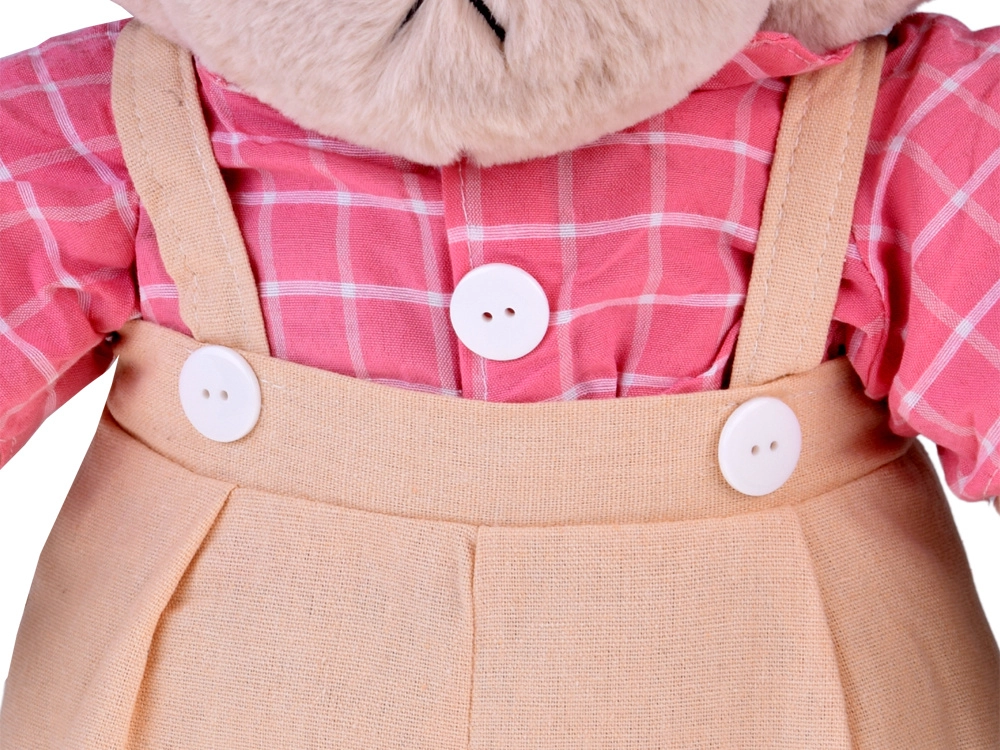 A rózsaszín-fehér kockás ing tépőzárral záródik (a díszgombok nem funkcionálisak), a világos nadrág/rövidnadrág szintén könnyen levehető – a teljes szettet egyszerűen kimoshatja vagy kivasalhatja. A precíz varrás és a gondos kidolgozás hosszú élettartamot és biztonságos játékot garantál.