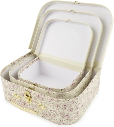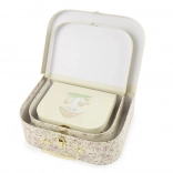 Ez az elegáns bőröndszett remek választás a gyerekholmi rendszerezéséhez és bájos lakáskiegészítőként is. A könnyű, mégis erős karton szerkezet fém kiegészítőkkel tartósságot és kényelmes hordozást biztosít. A különböző méreteknek köszönhetően a gyerekek könnyen kiválasztják a megfelelőt kirándulásra, óvodába vagy a nagyihoz.