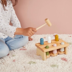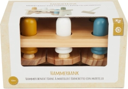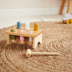 A kalapácsos, pad formájú fa kalapálós játék végtelen szórakozást és tanulást nyújt. A színes pálcikák beütése közben egyes elemek ellentétes irányban mozognak, ami szemléletesen mutatja meg a gyerekeknek az ok és okozat működését. Masszív kivitelének és simára csiszolt éleinek köszönhetően a játék biztonságos és kellemes tapintású.
