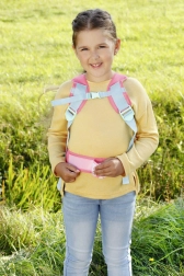 A puha, párnázott pántok, a mellcsat és a deréköv stabilitást biztosítanak, míg az állítható csatok könnyen alkalmazkodnak a gyermek alkatához. Finom virágos és parkos motívumok, szitakötőkkel és tavirózsákkal, varázslatos megjelenést kölcsönöznek a kiegészítőnek, amely serkenti a képzeletet.
